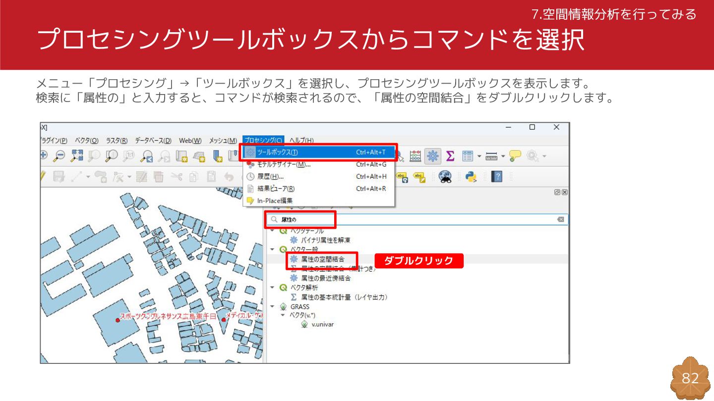 プロセシングツールボックスからコマンドを選択 82 メニュー「プロセシング」→「ツールボックス」を選択し、プロセシングツールボックスを表示します。 検索に「属性の」と入力すると、コマンドが検索されるので、「属性の空間結合」をダブルクリックします。 7.空間情報分析を行ってみる ダブルクリック