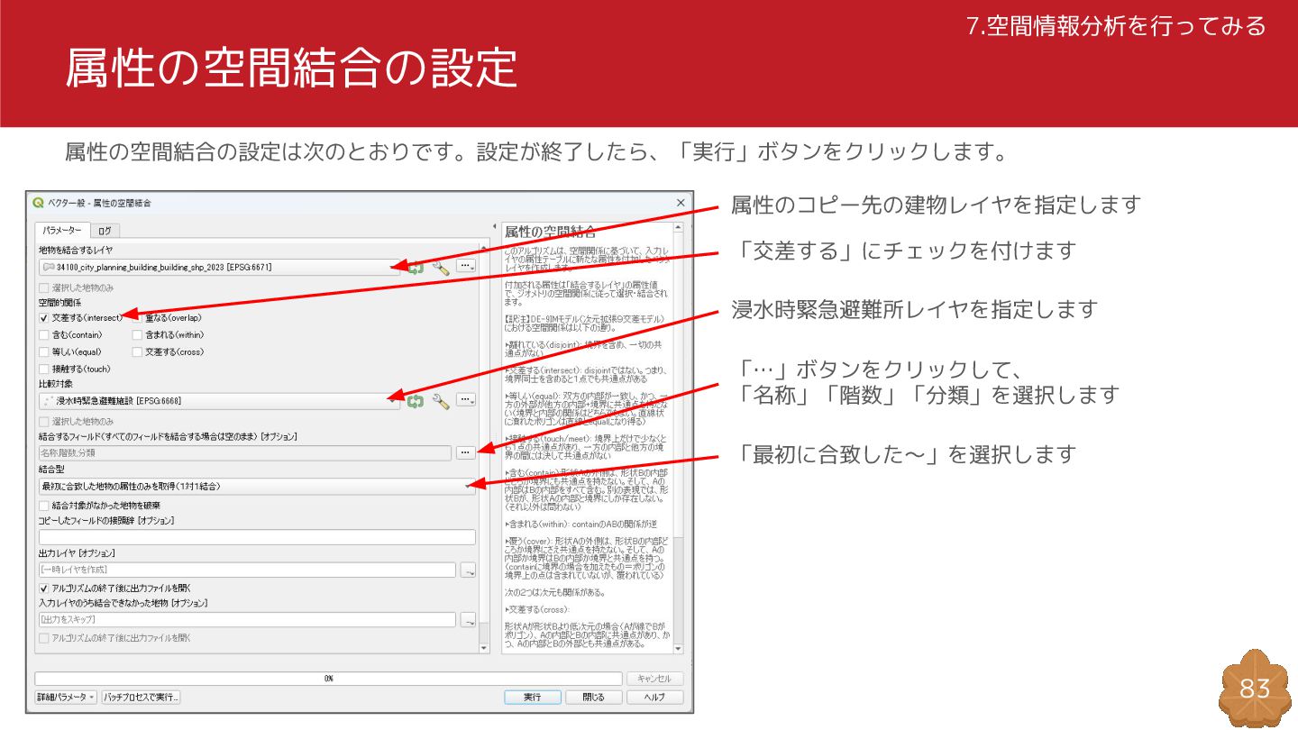 属性の空間結合の設定 83 属性の空間結合の設定は次のとおりです。設定が終了したら、「実行」ボタンをクリックします。 7.空間情報分析を行ってみる 属性のコピー先の建物レイヤを指定します 「交差する」にチェックを付けます 浸水時緊急避難所レイヤを指定します 「…」ボタンをクリックして、 「名称」「階数」「分類」を選択します 「最初に合致した~」を選択します