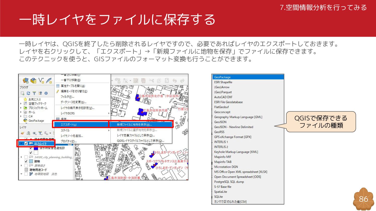 一時レイヤをファイルに保存する 86 一時レイヤは、QGISを終了したら削除されるレイヤですので、必要であればレイヤのエクスポートしておきます。 レイヤを右クリックして、「エクスポート」→「新規ファイルに地物を保存」でファイルに保存できます。 このテクニックを使うと、GISファイルのフォーマット変換も行うことができます。 7.空間情報分析を行ってみる QGISで保存できる ファイルの種類