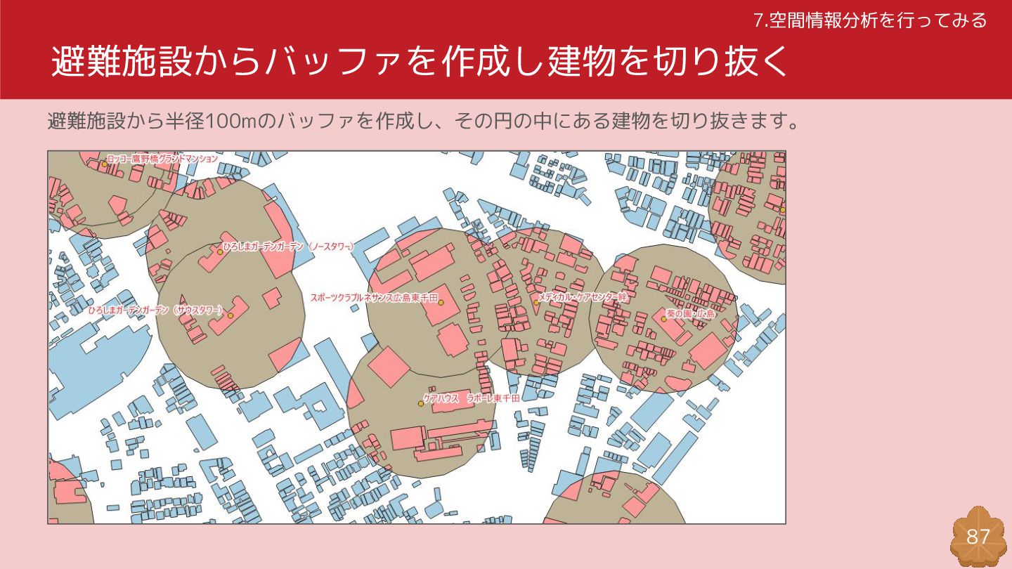 避難施設からバッファを作成し建物を切り抜く 87 避難施設から半径100mのバッファを作成し、その円の中にある建物を切り抜きます。 7.空間情報分析を行ってみる