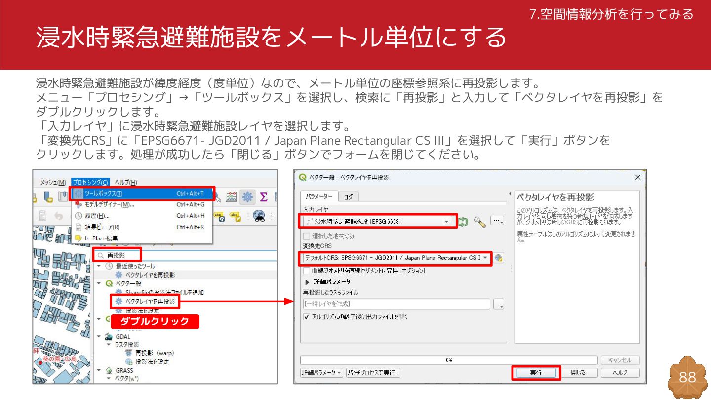浸水時緊急避難施設をメートル単位にする 88 浸水時緊急避難施設が緯度経度(度単位)なので、メートル単位の座標参照系に再投影します。 メニュー「プロセシング」→「ツールボックス」を選択し、検索に「再投影」と入力して「ベクタレイヤを再投影」を ダブルクリックします。 「入力レイヤ」に浸水時緊急避難施設レイヤを選択します。 「変換先CRS」に「EPSG6671- JGD2011 / Japan