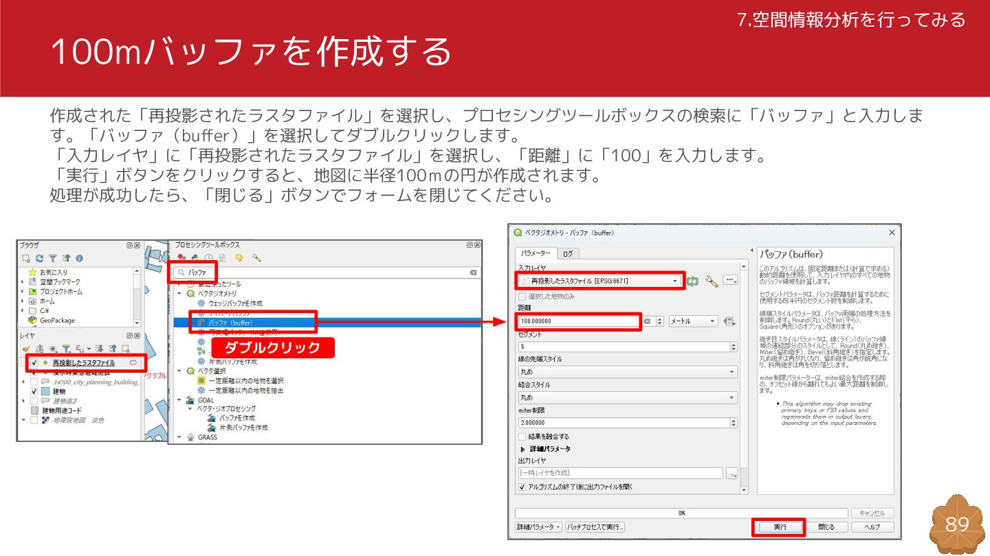 100mバッファを作成する 89 作成された「再投影されたラスタファイル」を選択し、プロセシングツールボックスの検索に「バッファ」と入力しま す。「バッファ(buffer)」を選択してダブルクリックします。 「入力レイヤ」に「再投影されたラスタファイル」を選択し、「距離」に「100」を入力します。 「実行」ボタンをクリックすると、地図に半径100mの円が作成されます。 処理が成功したら、「閉じる」ボタンでフォームを閉じてください。 7.空間情報分析を行ってみる ダブルクリック