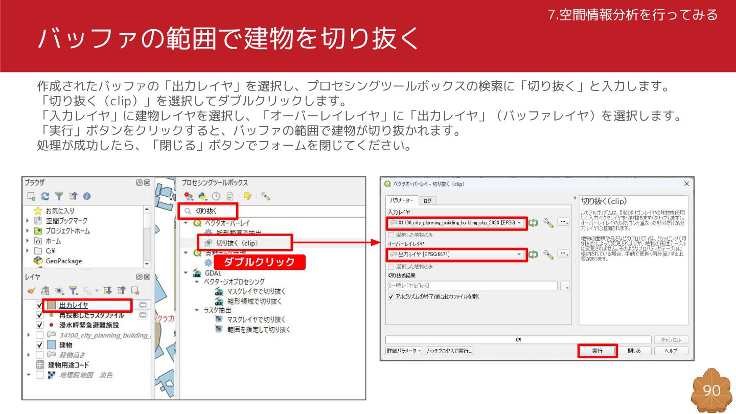 バッファの範囲で建物を切り抜く 90 作成されたバッファの「出力レイヤ」を選択し、プロセシングツールボックスの検索に「切り抜く」と入力します。 「切り抜く(clip)」を選択してダブルクリックします。 「入力レイヤ」に建物レイヤを選択し、「オーバーレイレイヤ」に「出力レイヤ」(バッファレイヤ)を選択します。 「実行」ボタンをクリックすると、バッファの範囲で建物が切り抜かれます。 処理が成功したら、「閉じる」ボタンでフォームを閉じてください。 7.空間情報分析を行ってみる ダブルクリック