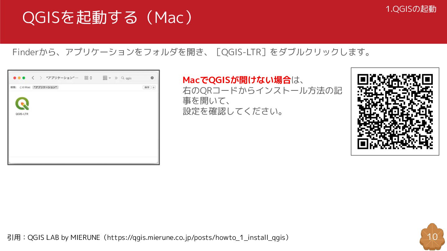 QGISを起動する(Mac) 10 Finderから、アプリケーションをフォルダを開き、[QGIS-LTR]をダブルクリックします。 引用:QGIS LAB by MIERUNE(https://qgis.mierune.co.jp/posts/howto_1_install_qgis) MacでQGISが開けない場合は、 右のQRコードからインストール方法の記 事を開いて、