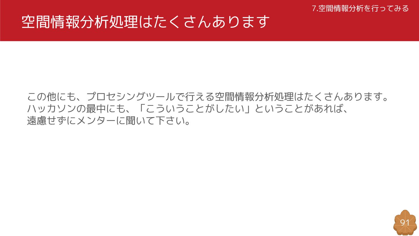 空間情報分析処理はたくさんあります 91 この他にも、プロセシングツールで行える空間情報分析処理はたくさんあります。 ハッカソンの最中にも、「こういうことがしたい」ということがあれば、 遠慮せずにメンターに聞いて下さい。 7.空間情報分析を行ってみる