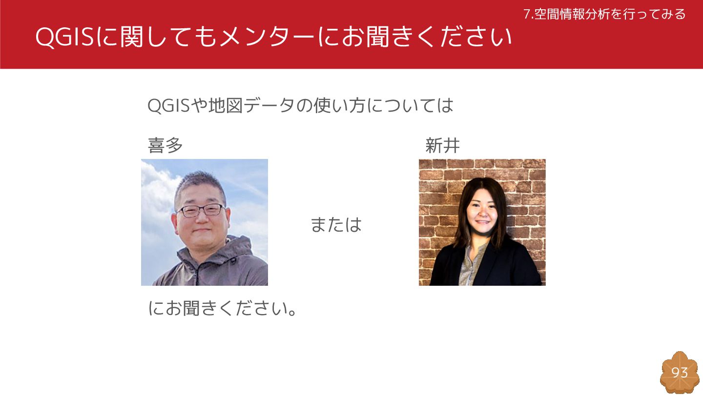 QGISに関してもメンターにお聞きください 93 7.空間情報分析を行ってみる にお聞きください。 QGISや地図データの使い方については 喜多 または 新井