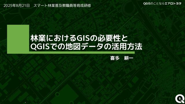 1 QGISのことならエアロトヨタ 林業におけるGISの必要性と QGISでの地図データの活用方法 喜多 耕一 1 2025年8月21日 スマート林業普及教職員等育成研修