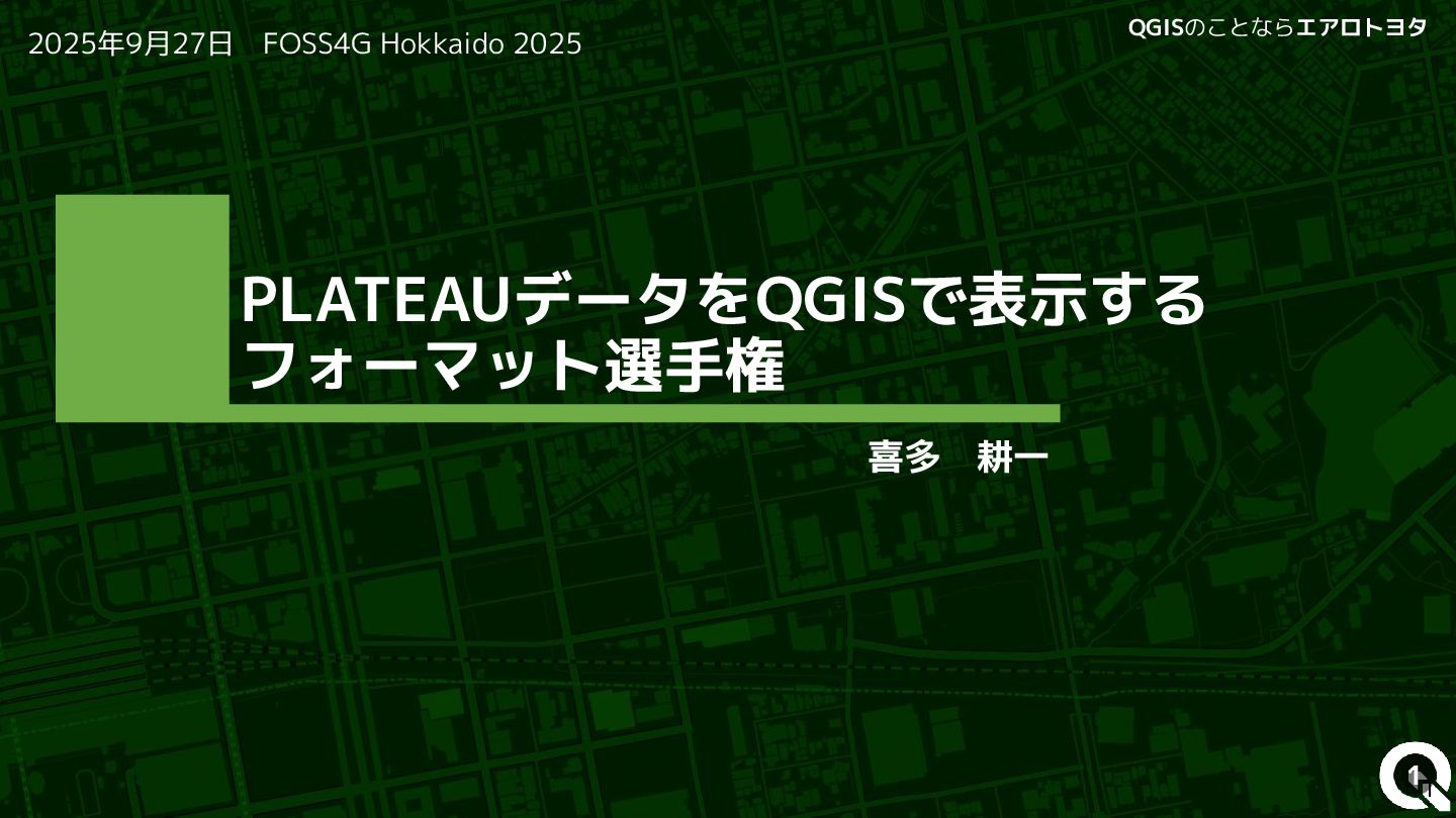1 QGISのことならエアロトヨタ PLATEAUデータをQGISで表示する フォーマット選手権 喜多 耕一 1 2025年9月27日 FOSS4G Hokkaido 2025