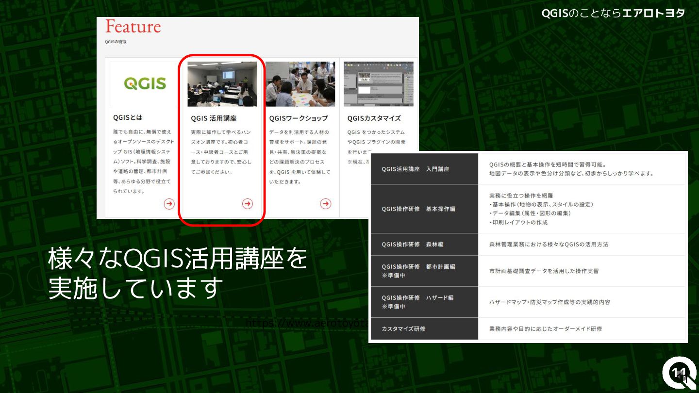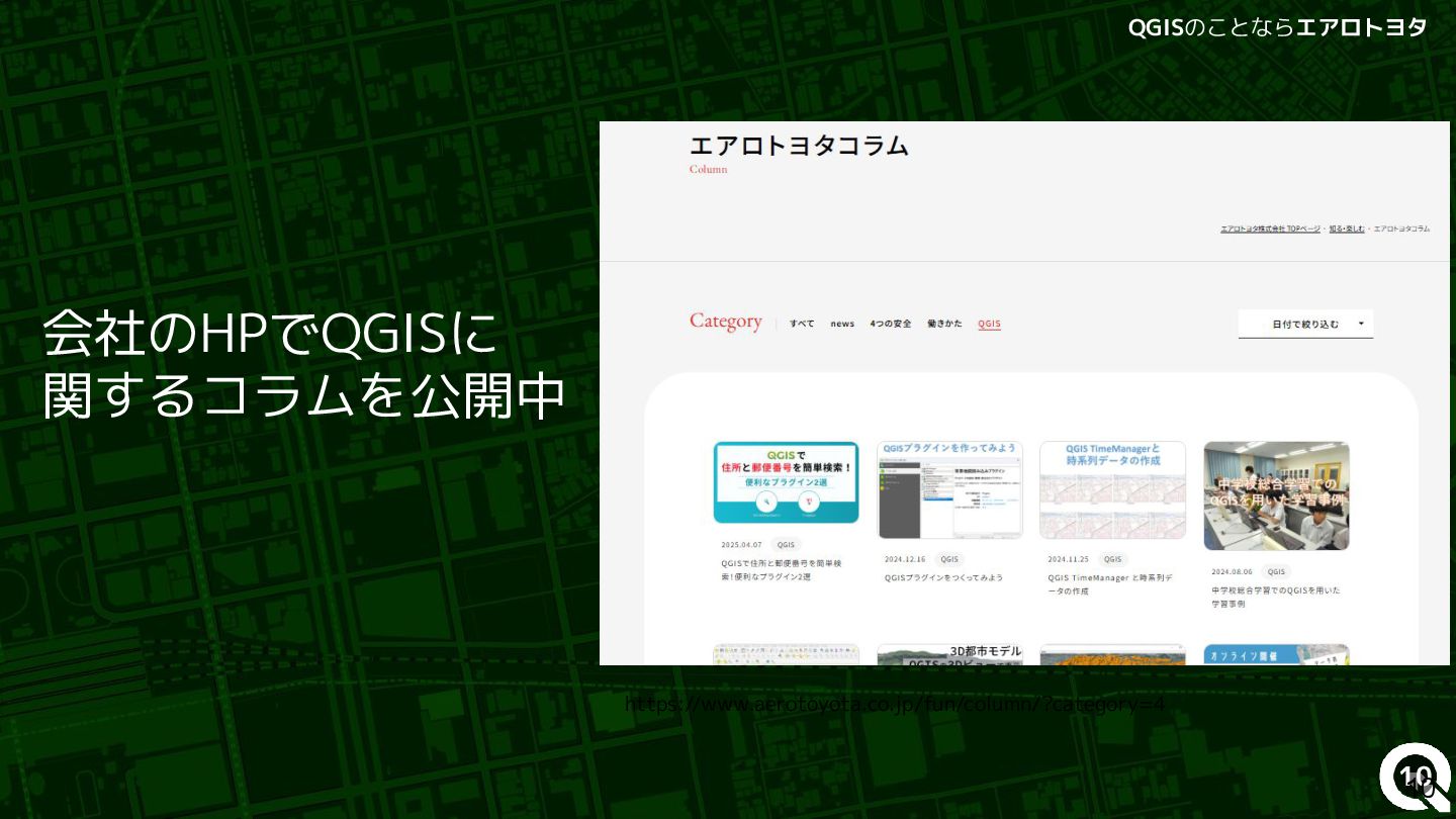 10 QGISのことならエアロトヨタ 10 会社のHPでQGISに 関するコラムを公開中 https://www.aerotoyota.co.jp/fun/column/?category=4