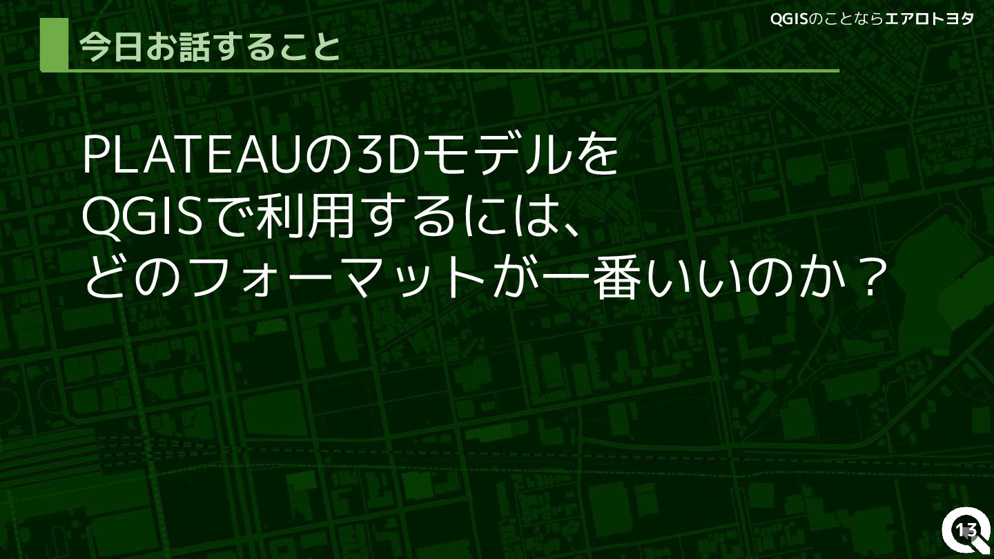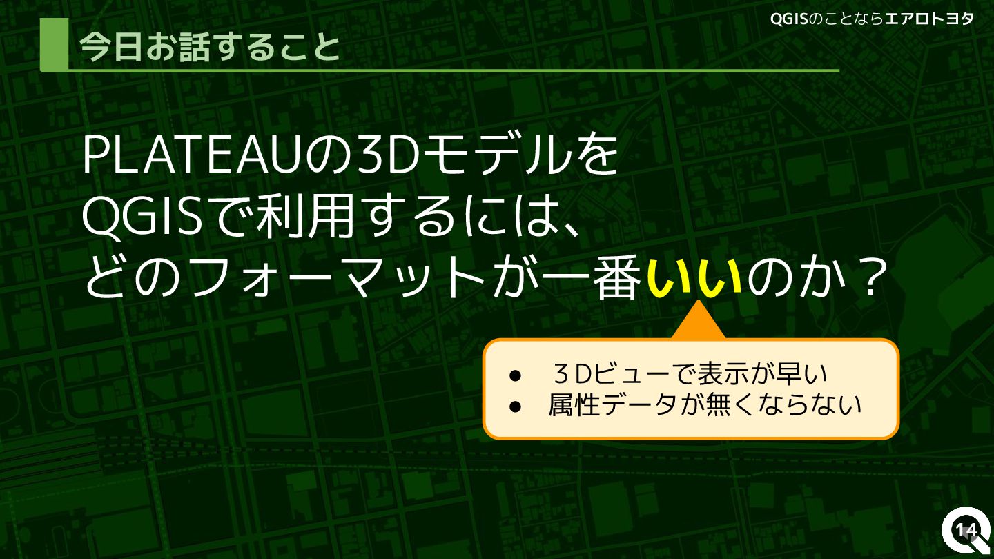13 QGISのことならエアロトヨタ 今日お話すること PLATEAUの3Dモデルを QGISで利用するには、 どのフォーマットが一番いいのか?