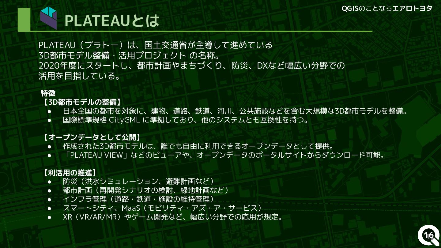 16 QGISのことならエアロトヨタ PLATEAUとは PLATEAU(プラトー)は、国土交通省が主導して進めている 3D都市モデル整備・活用プロジェクト の名称。 2020年度にスタートし、都市計画やまちづくり、防災、DXなど幅広い分野での 活用を目指している。 特徴 【3D都市モデルの整備】