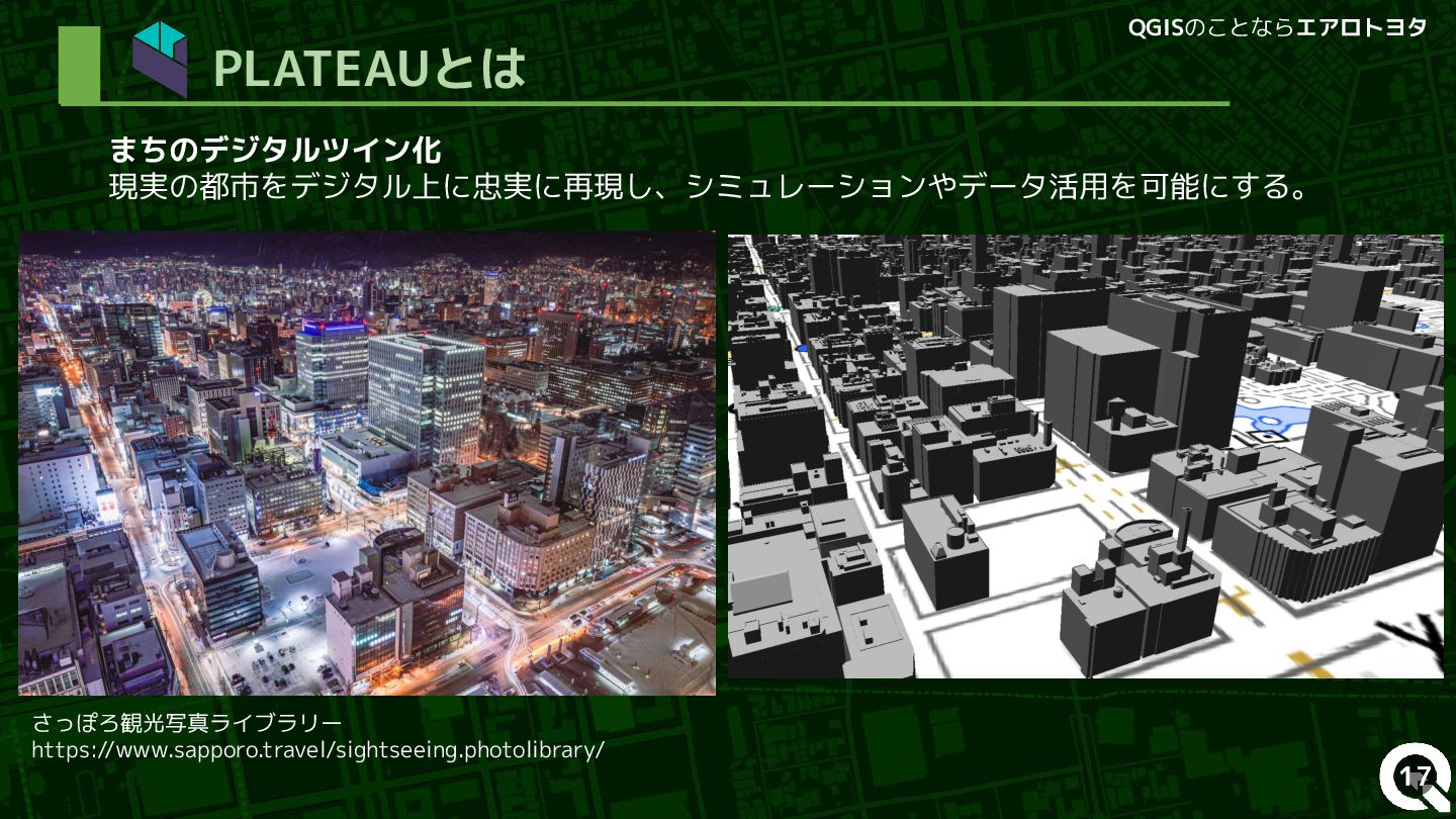 17 QGISのことならエアロトヨタ PLATEAUとは まちのデジタルツイン化 現実の都市をデジタル上に忠実に再現し、シミュレーションやデータ活用を可能にする。 さっぽろ観光写真ライブラリー https://www.sapporo.travel/sightseeing.photolibrary/