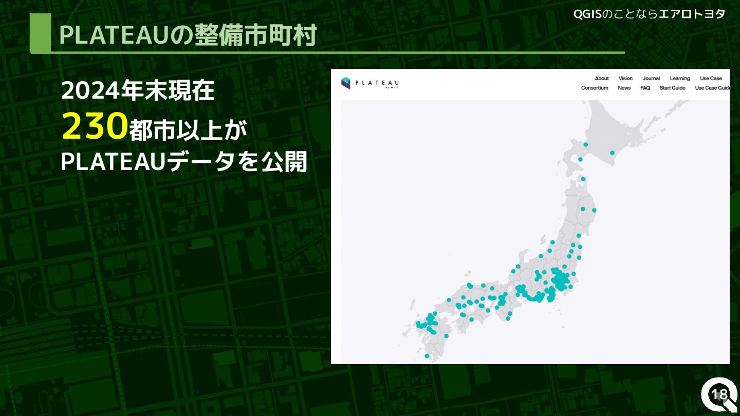 18 QGISのことならエアロトヨタ PLATEAUの整備市町村 2024年末現在 230都市以上が PLATEAUデータを公開