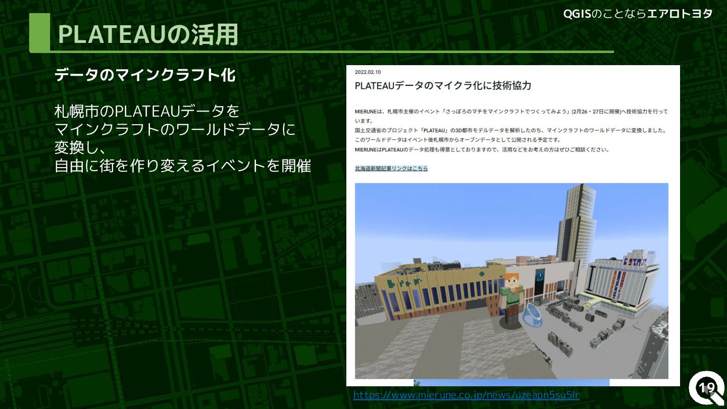 19 QGISのことならエアロトヨタ PLATEAUの活用 データのマインクラフト化 札幌市のPLATEAUデータを マインクラフトのワールドデータに 変換し、 自由に街を作り変えるイベントを開催 https://www.mierune.co.jp/news/uzeapn5su5lr