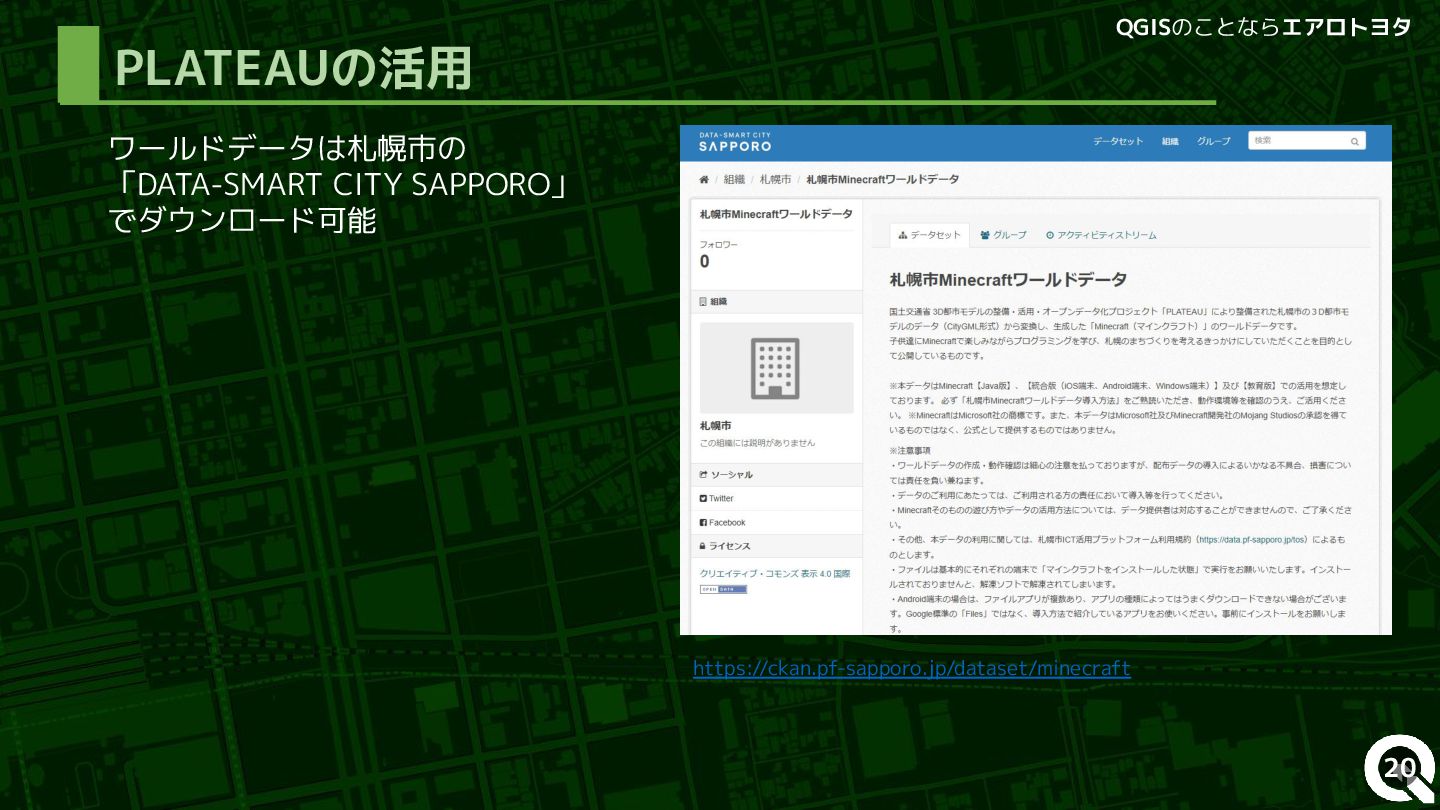 20 QGISのことならエアロトヨタ PLATEAUの活用 ワールドデータは札幌市の 「DATA-SMART CITY SAPPORO」 でダウンロード可能 https://ckan.pf-sapporo.jp/dataset/minecraft