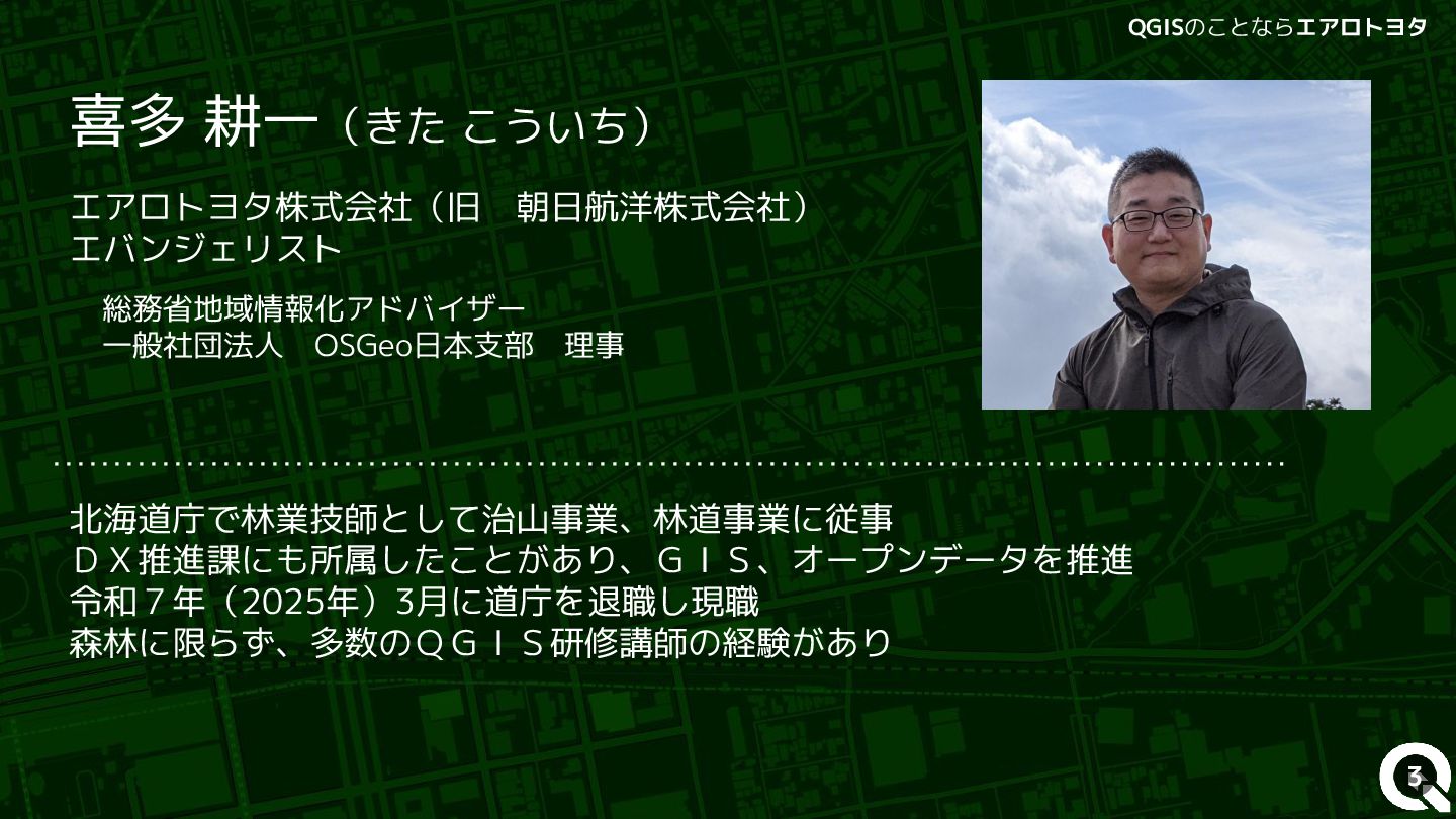 3 QGISのことならエアロトヨタ 喜多 耕一(きた こういち) エアロトヨタ株式会社(旧 朝日航洋株式会社) エバンジェリスト 総務省地域情報化アドバイザー 一般社団法人 OSGeo日本支部 理事 北海道庁で林業技師として治山事業、林道事業に従事