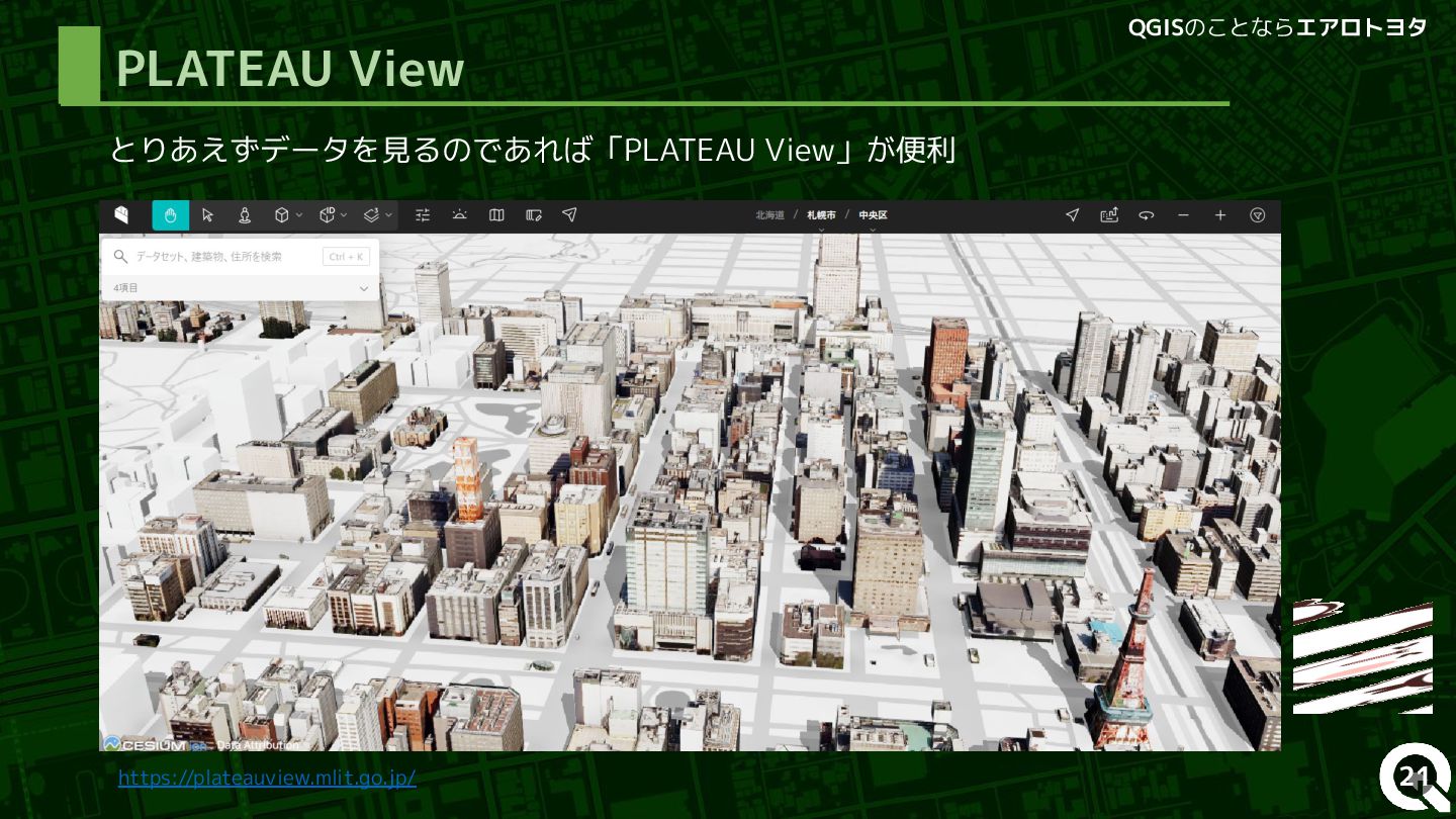 21 QGISのことならエアロトヨタ PLATEAU View とりあえずデータを見るのであれば「PLATEAU View」が便利 https://plateauview.mlit.go.jp/