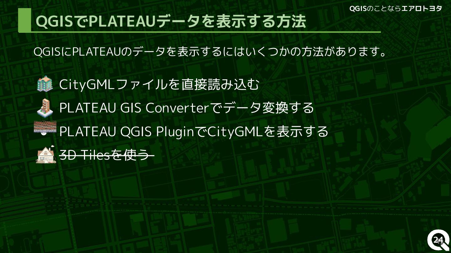 24 QGISのことならエアロトヨタ QGISでPLATEAUデータを表示する方法 QGISにPLATEAUのデータを表示するにはいくつかの方法があります。 • CityGMLファイルを直接読み込む • PLATEAU GIS Converterでデータ変換する