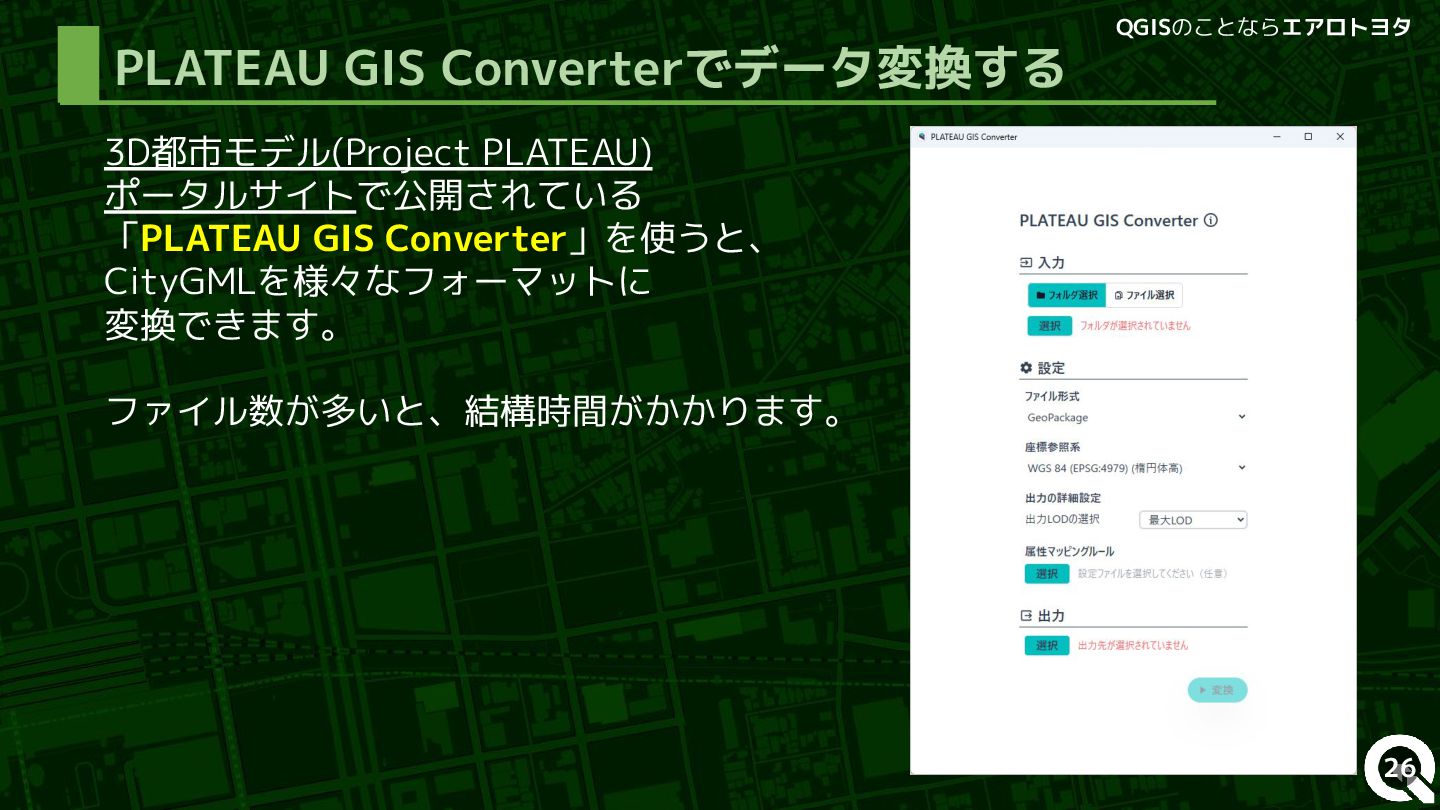 26 QGISのことならエアロトヨタ PLATEAU GIS Converterでデータ変換する 3D都市モデル(Project PLATEAU) ポータルサイトで公開されている 「PLATEAU GIS