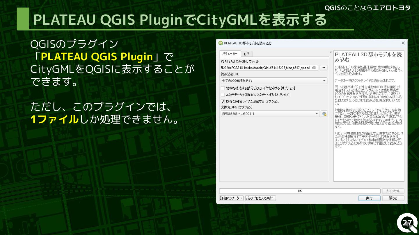 27 QGISのことならエアロトヨタ PLATEAU QGIS PluginでCityGMLを表示する QGISのプラグイン 「PLATEAU QGIS Plugin」で CityGMLをQGISに表示することが