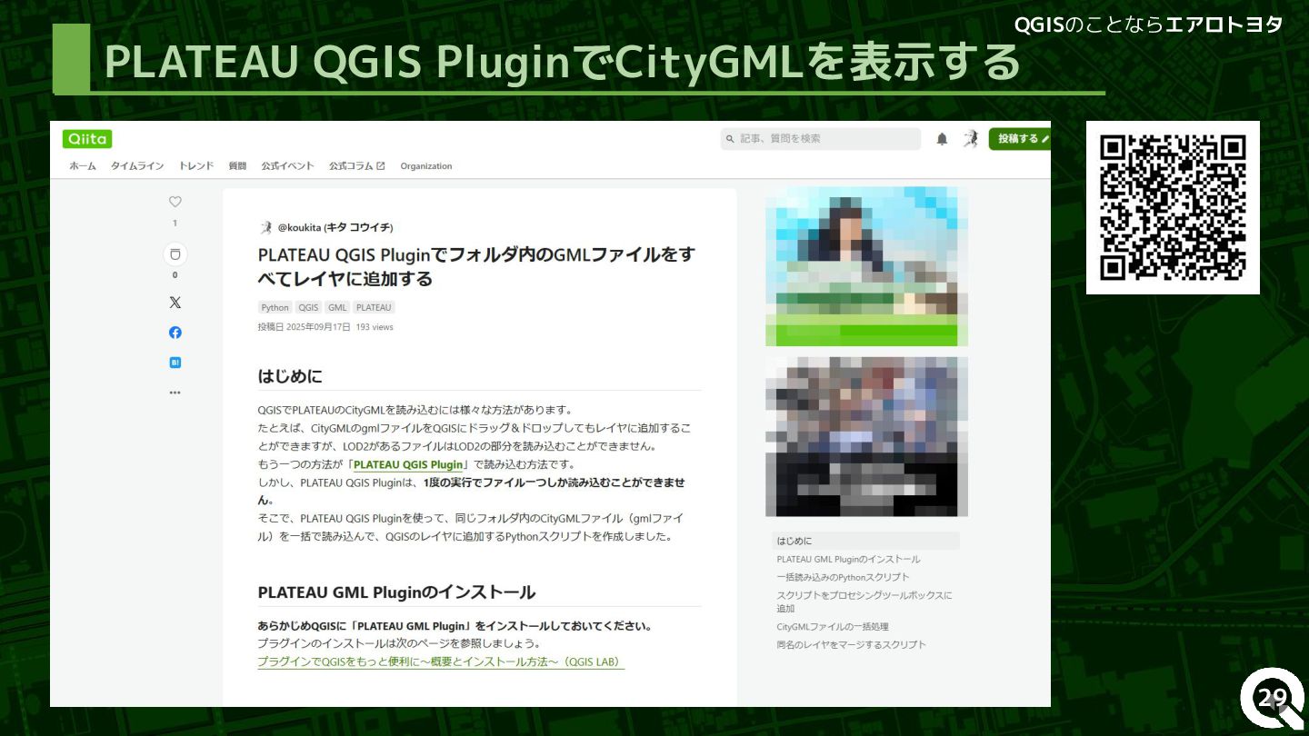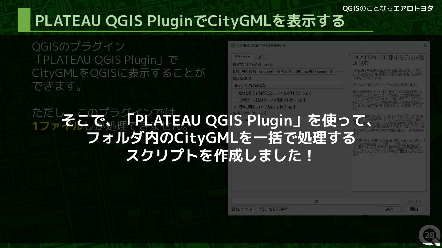 28 QGISのことならエアロトヨタ PLATEAU QGIS PluginでCityGMLを表示する QGISのプラグイン 「PLATEAU QGIS Plugin」で CityGMLをQGISに表示することが