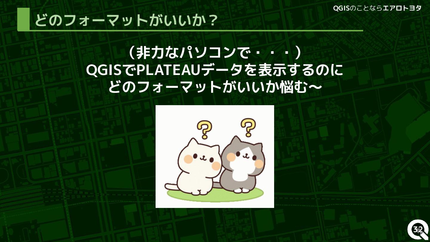 32 QGISのことならエアロトヨタ どのフォーマットがいいか? (非力なパソコンで・・・) QGISでPLATEAUデータを表示するのに どのフォーマットがいいか悩む~