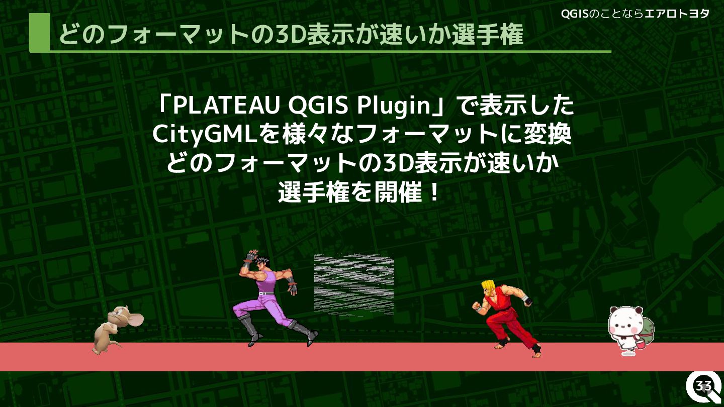 33 QGISのことならエアロトヨタ どのフォーマットの3D表示が速いか選手権 「PLATEAU QGIS Plugin」で表示した CityGMLを様々なフォーマットに変換 どのフォーマットの3D表示が速いか 選手権を開催!