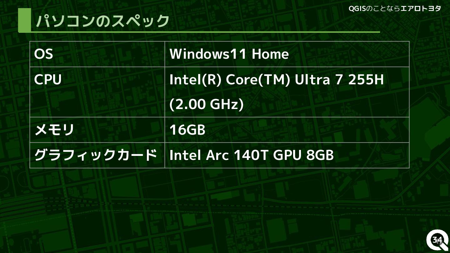 34 QGISのことならエアロトヨタ パソコンのスペック OS Windows11 Home CPU Intel(R) Core(TM) Ultra