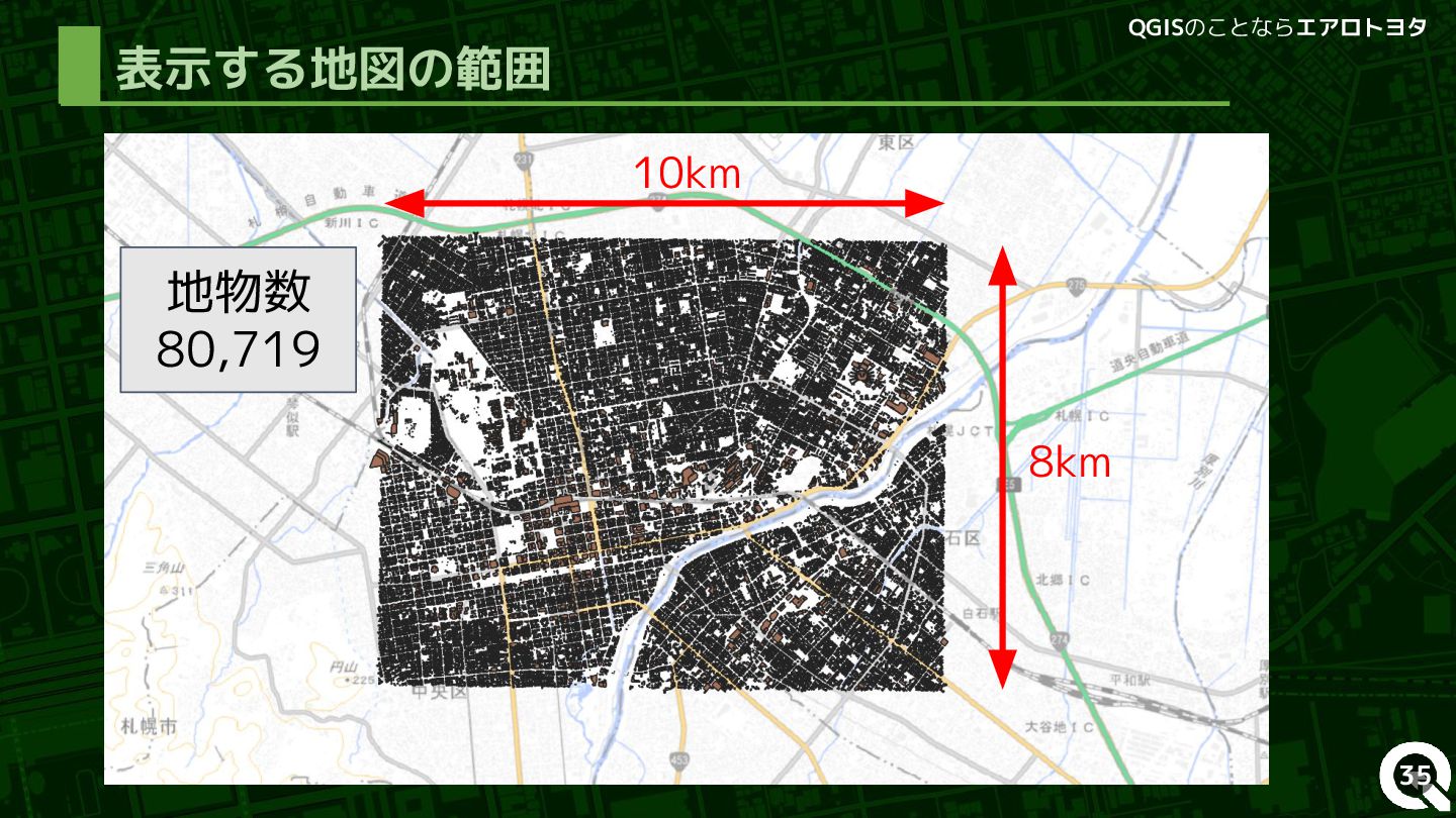 35 QGISのことならエアロトヨタ 表示する地図の範囲 10km 8km 地物数 80,719