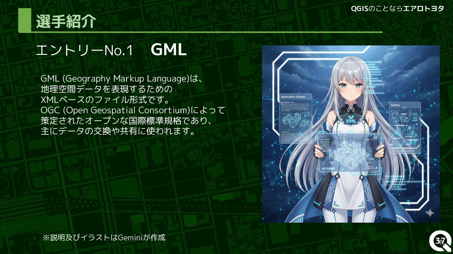 37 QGISのことならエアロトヨタ 選手紹介 エントリーNo.1 GML GML (Geography Markup Language)は、 地理空間データを表現するための XMLベースのファイル形式です。