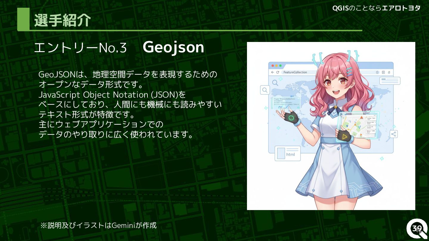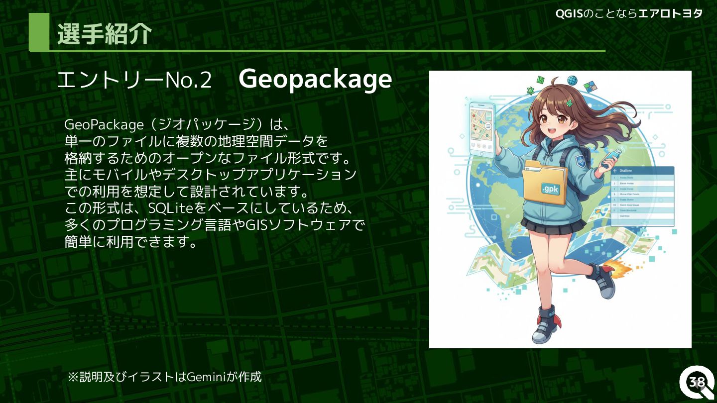 38 QGISのことならエアロトヨタ 選手紹介 エントリーNo.2 Geopackage GeoPackage(ジオパッケージ)は、 単一のファイルに複数の地理空間データを 格納するためのオープンなファイル形式です。 主にモバイルやデスクトップアプリケーション での利用を想定して設計されています。 この形式は、SQLiteをベースにしているため、