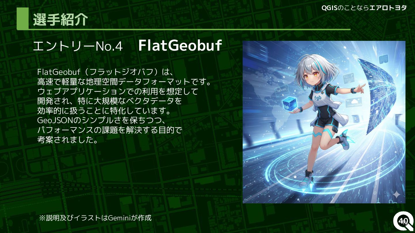 40 QGISのことならエアロトヨタ 選手紹介 エントリーNo.4 FlatGeobuf FlatGeobuf(フラットジオバフ)は、 高速で軽量な地理空間データフォーマットです。 ウェブアプリケーションでの利用を想定して 開発され、特に大規模なベクタデータを 効率的に扱うことに特化しています。 GeoJSONのシンプルさを保ちつつ、