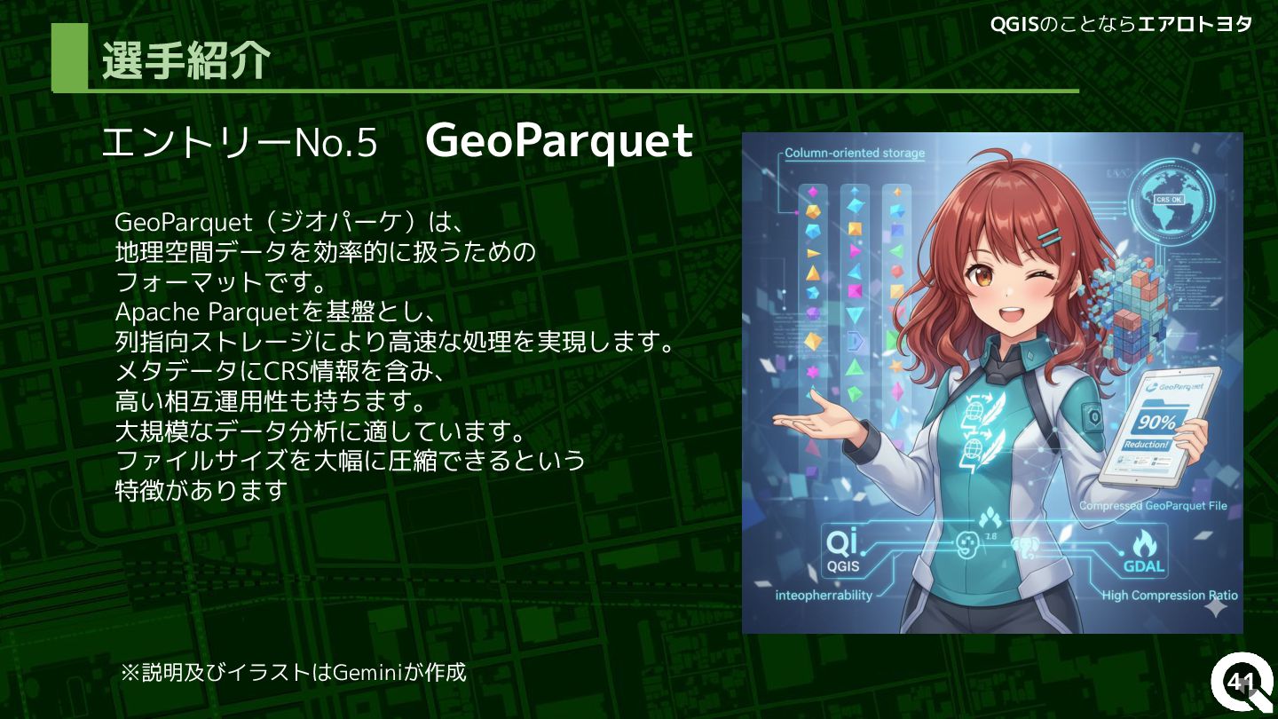 41 QGISのことならエアロトヨタ 選手紹介 エントリーNo.5 GeoParquet GeoParquet(ジオパーケ)は、 地理空間データを効率的に扱うための フォーマットです。 Apache Parquetを基盤とし、 列指向ストレージにより高速な処理を実現します。