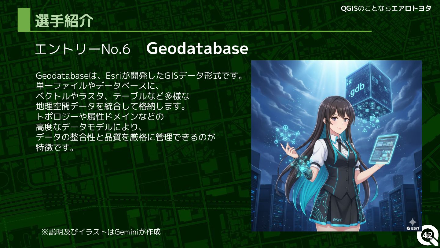 42 QGISのことならエアロトヨタ 選手紹介 エントリーNo.6 Geodatabase Geodatabaseは、Esriが開発したGISデータ形式です。 単一ファイルやデータベースに、 ベクトルやラスタ、テーブルなど多様な 地理空間データを統合して格納します。 トポロジーや属性ドメインなどの 高度なデータモデルにより、
