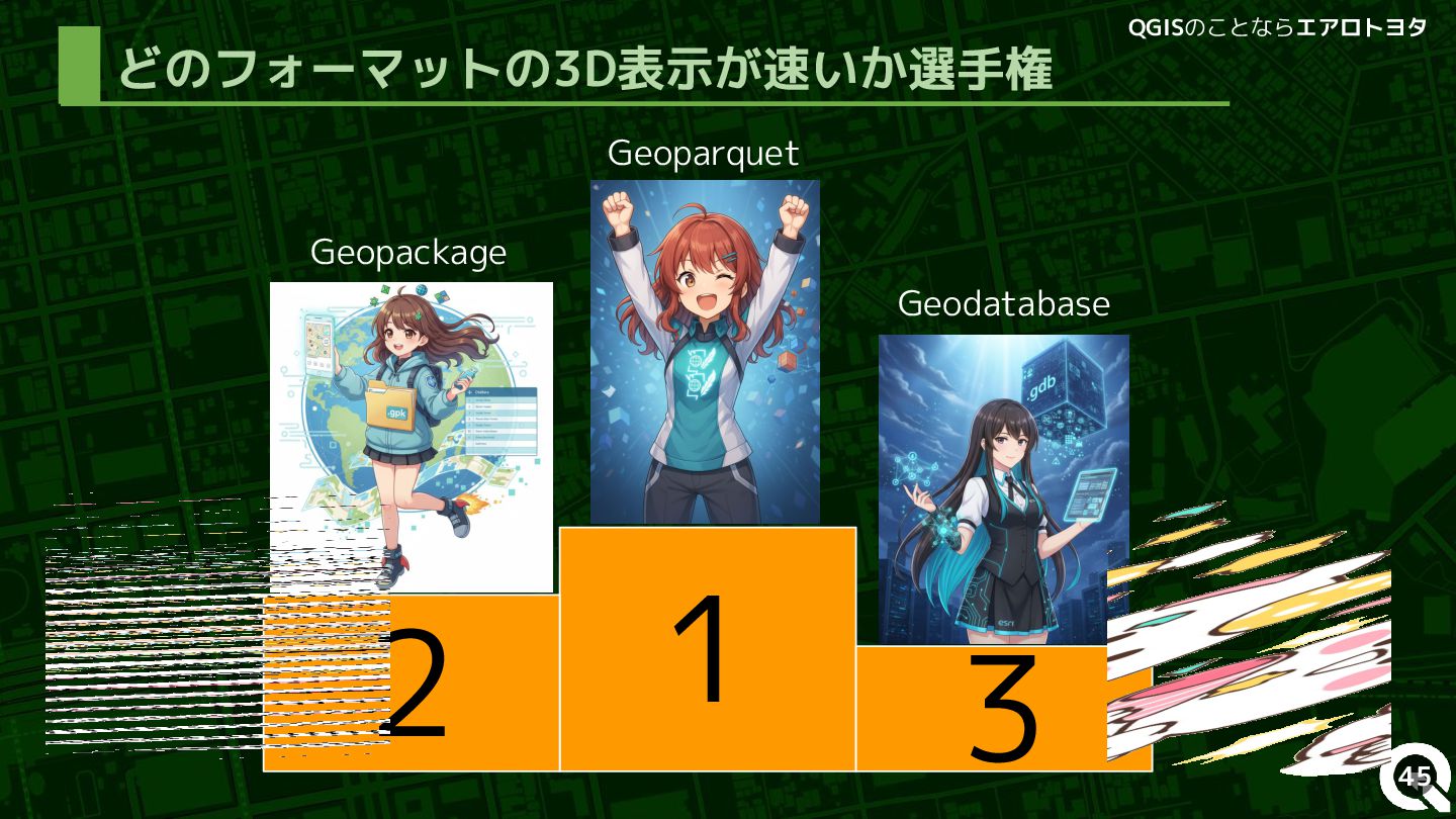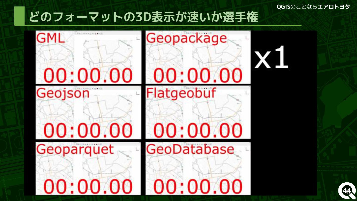 45 QGISのことならエアロトヨタ どのフォーマットの3D表示が速いか選手権 1 2 3 Geopackage Geodatabase Geoparquet