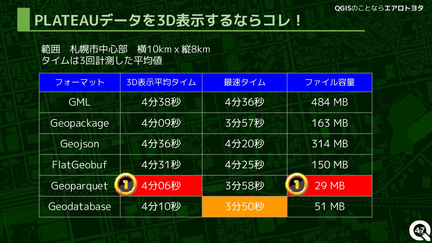 47 QGISのことならエアロトヨタ PLATEAUデータを3D表示するならコレ! フォーマット 3D表示平均タイム 最速タイム ファイル容量 GML 4分38秒 4分36秒