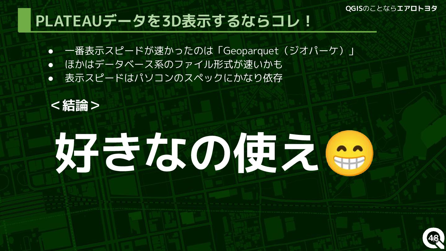 48 QGISのことならエアロトヨタ PLATEAUデータを3D表示するならコレ! • 一番表示スピードが速かったのは「Geoparquet(ジオパーケ)」 • ほかはデータベース系のファイル形式が速いかも • 表示スピードはパソコンのスペックにかなり依存 <結論>