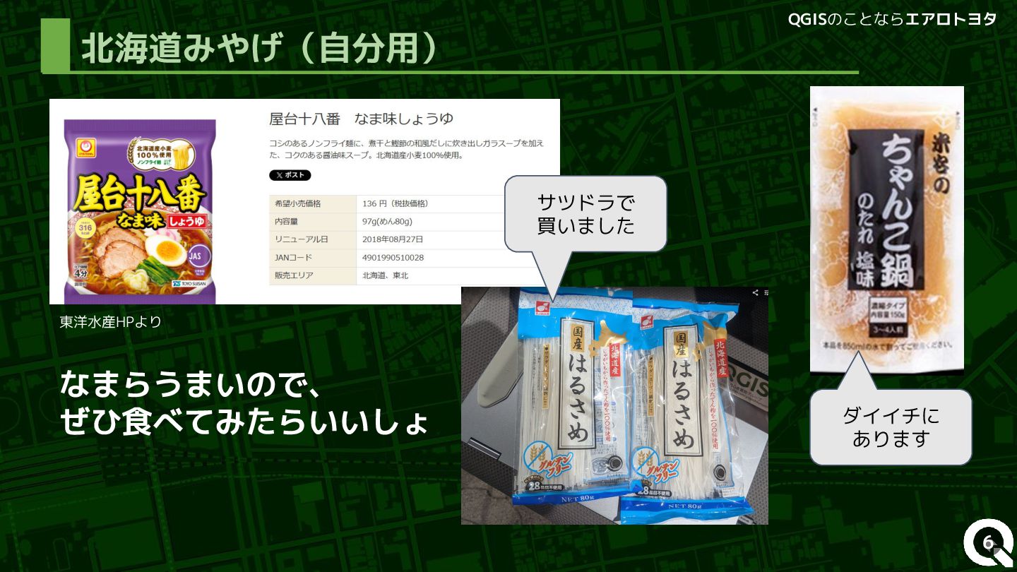 6 QGISのことならエアロトヨタ 北海道みやげ(自分用) なまらうまいので、 ぜひ食べてみたらいいしょ 東洋水産HPより サツドラで 買いました ダイイチに あります