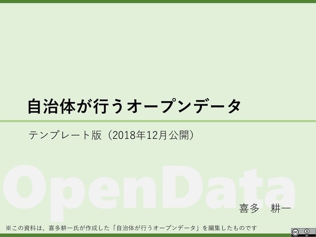スライドのどこかに「この資料は、喜多耕一氏が作成した「自治体が行うオープンデータ」を編集したものです」と記載していただければと思います。