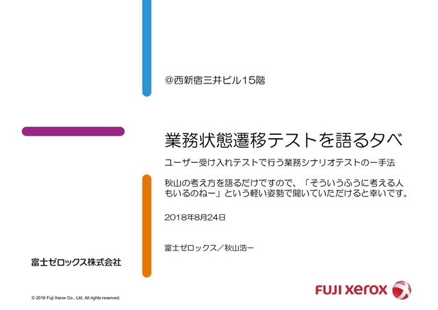 ʮ)":45๏Ͱ࡞ͬͨදʹςετ͍ͨ͜͠ͱ͕ɺͻͱͭग़ͯ͜ͳ͍ʯɺɺɺͱɺͨ·ʹݴΘΕΔ • ʢύλʔϯʣ͖ΘͲ͍ۀϑϩʔΛςετ͍ͨ͠ Ð ʢྫʣอݥͷຬظ͕͍͍ۙͮͯΔ͜ͱͷ௨Λग़ͨ͠ޙʹɺຬظલʹಛ݅Λม͑ͨͱ͖Λςετ͍ͨ͠ • ʮͦ͏͍͏ྑ͍ςετ͕ࢥ͍͍ͭͨΒɺͲΜͲΜ͍ͯͩ͘͠͞ɻࢲඞཁͱࢥ͍·͢Αʯͱݴ͏ͱʜʜ Ð ػೳؒͷ߹ͤΛཏͨ͠Βˋͷόάݟ͔ͭΔͬͯݴͬͨ͡Όͳ͍ͱౖΒΕΔ • ʢύλʔϯʣ͜Μͳ߹ͤݱ࣮ʹɺ͋Γಘͳ͍ͷͰςετͯ͠ҙຯ͕ͳ͍ Ð ʢྫʣੜ໋อݥਃࠐॻͷςετͰɿ ʮՃೖऀྸɿࡀ ʷ طԟɿೝʯͷ߹ͤΛςετͨͬͯ͠Ͷ͑ʜʜ • ʮͰͳͥͦͷ߹ͤͷೖྗΛڐ͍ͯ͠ΔͷͰ͔͢ʁʯͱฉ͍ͯΈΔͱʜʜ Ð ېଇͷ࣮Λ͢Δͷ໘͔ͩΒ • ʮʰࡀͷՃೖऀͷطԟ͕ೝʱɺ ઈରʹ͋Γ͑ͳ͍͜ͱͰ͔͢ʁʯͱฉ͍ͯΈΔͱʜʜ Ð ͋ͬͨͱͯ͠ස͕͍͔Βόά͍ͬͯͯϦεΫ͕͍ΜͰ͢ ʢ͜ͷίϯαϧɺϦεΫͷ֓೦ΛΒͳ͍Μ͡Όͳ͍͔ͳʙʣ Ð ʮʰ͍ɻ͍ɻʱΕͱ͍͏ͳΒɺΓ·͢Αɻ݅͘Β͍ςετ͕૿͑ͯɺͲ͏ͬͯ͜ͱͳ͍ʯʢ͛Γʣ ۀঢ়ଶભҠςετΛޠΔಈػ ʹ ཏܕͷۀςετ )":45๏ʢ߹ͤςετʣͬͯɺೖྗͷ͕ඇৗʹଟ͍ը໘ͷςετͰ͔͑͠ͳ͍Μ͡Όͳ͍ʁ ʰ͖ΘͲ͍݅Ͱɺόά͕Ͱͦ͏ͳͱ͜ΖʱΛςετ͍ͨ͠ʂʢଟ͘ͷςετΤϯδχΞͷʣ ˻छྨͷςετ˼ ཏܕͷςετɿ ςετ͖͢؍ʢΧόϨοδΞΠςϜʣʹ͍ͭͯཏతʹධՁ࣭͠Λอূ͢Δ ݕग़ܕͷςετɿ ো͕ଟ͍ͱਪଌ͞ΕΔՕॴॏཁͷߴ͍Օॴʹૂ͍ΛߜͬͯධՁ͢Δ͜ͱͰ গͳ͍खؒͰૉૣ͘ଟ͘ͷةݥͳোΛݕग़͢Δ ʲݱ࣮తͳͰߴ͍࣭Λୡ͢ΔͨΊʹ྆ऀͷόϥϯεΛͱΔ͠ʳ 42V#0,7QΑΓ