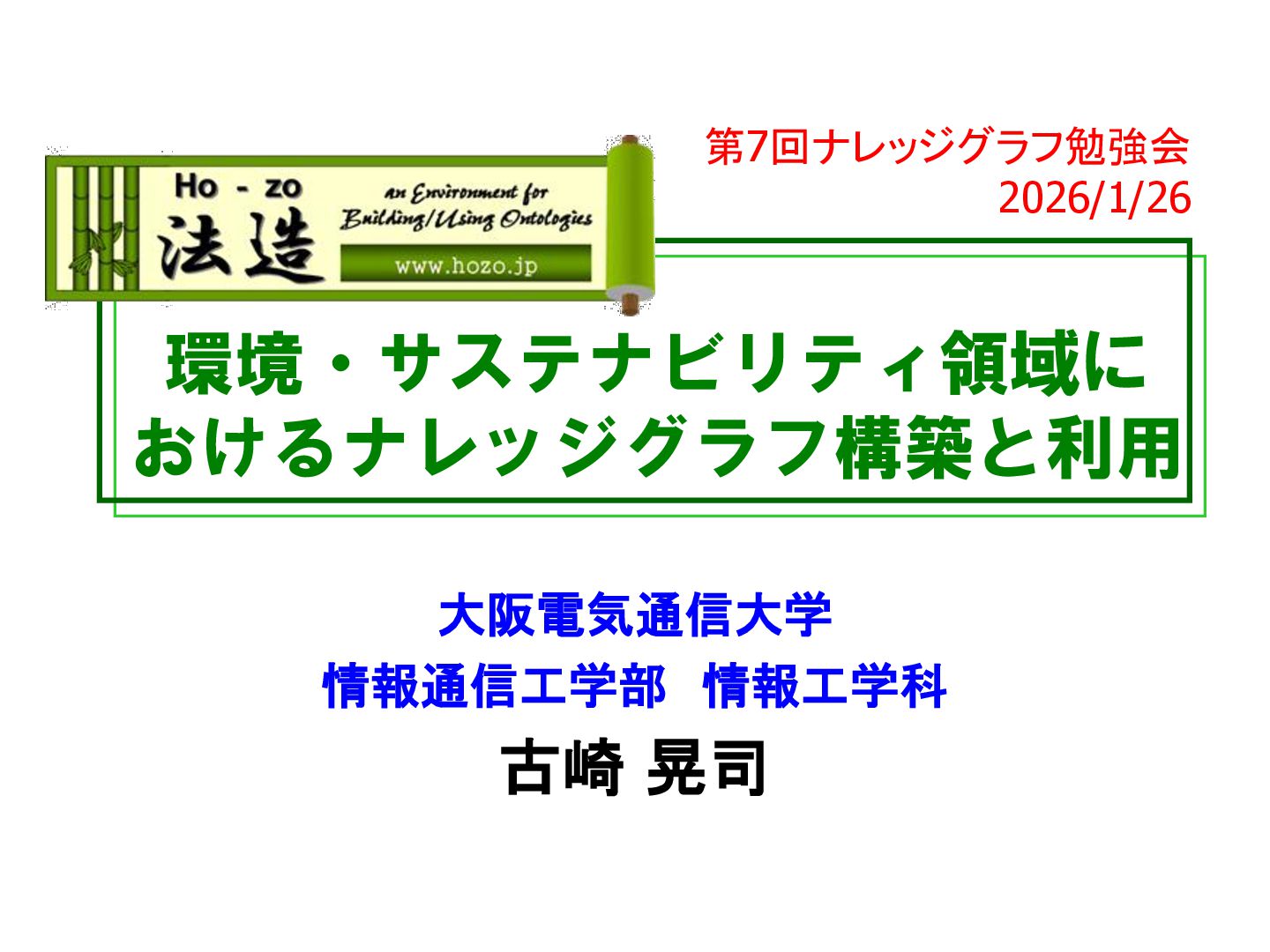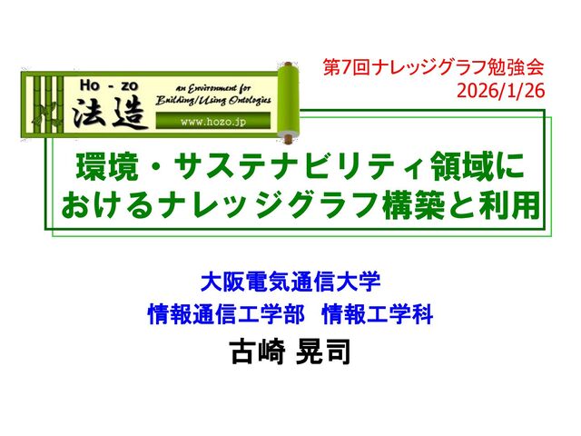 環境・サステナビリティ領域に おけるナレッジグラフ構築と利用 大阪電気通信大学 情報通信工学部 情報工学科 古崎 晃司 第7回ナレッジグラフ勉強会 2026/1/26