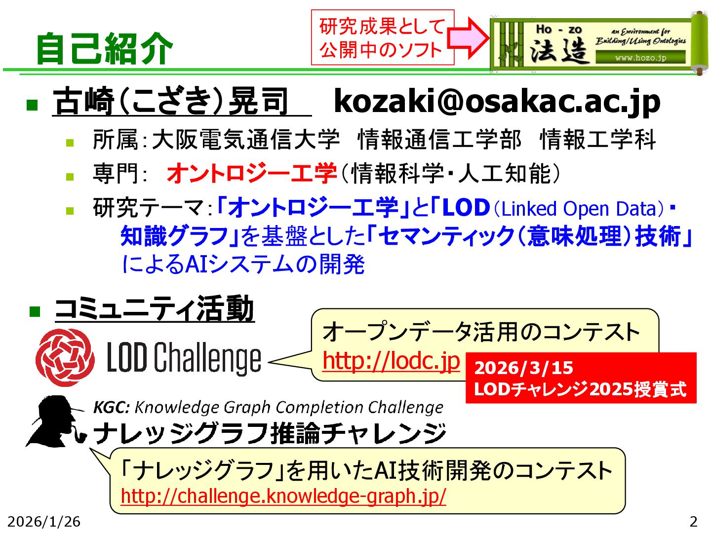 情報通信工学部 情報工学科 ◼ 専門: オントロジー工学(情報科学・人工知能) ◼ 研究テーマ:「オントロジー工学」と「LOD(Linked Open Data)・ 知識グラフ」を基盤とした「セマンティック(意味処理)技術」 によるAIシステムの開発 「ナレッジグラフ」を用いたAI技術開発のコンテスト http://challenge.knowledge-graph.jp/ オープンデータ活用のコンテスト http://lodc.jp 2026/1/26 2 2026/3/15 LODチャレンジ2025授賞式