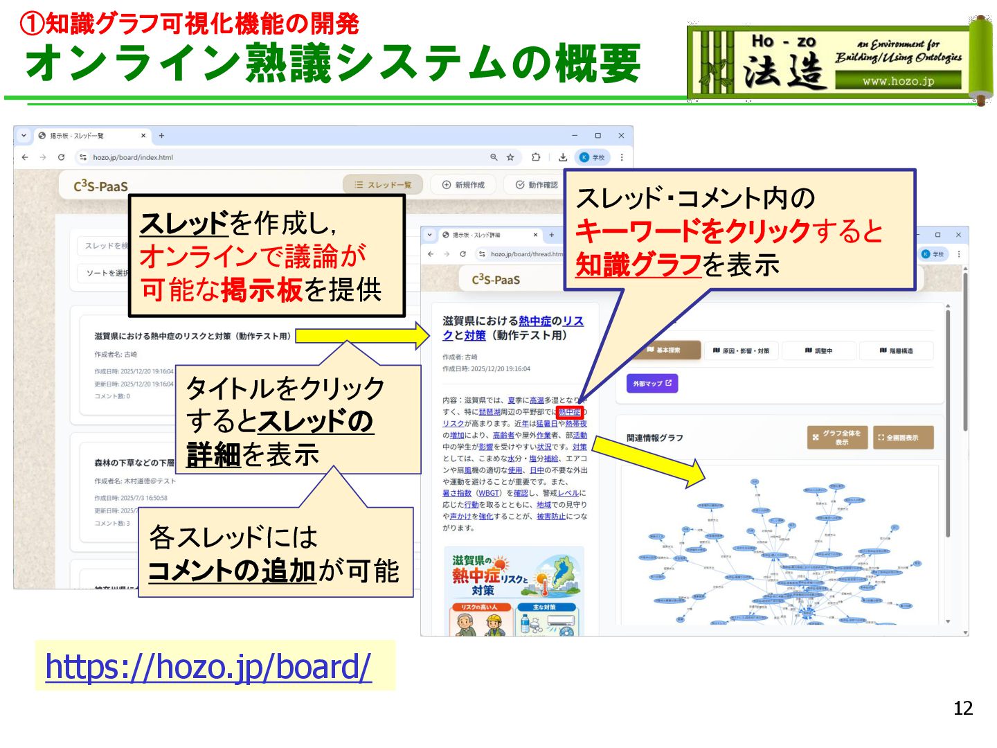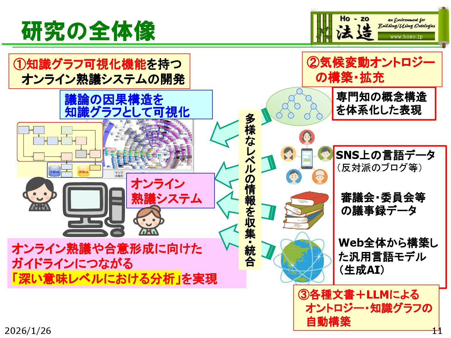 ガイドラインにつながる 「深い意味レベルにおける分析」を実現 議論の因果構造を 知識グラフとして可視化 オンライン 熟議システム 多 様 な レ ベ ル の 情 報 を 収 集 ・ 統 合 ②気候変動オントロジー の構築・拡充 ③各種文書+LLMによる オントロジー・知識グラフの 自動構築 研究の全体像 ①知識グラフ可視化機能を持つ オンライン熟議システムの開発 2026/1/26 11