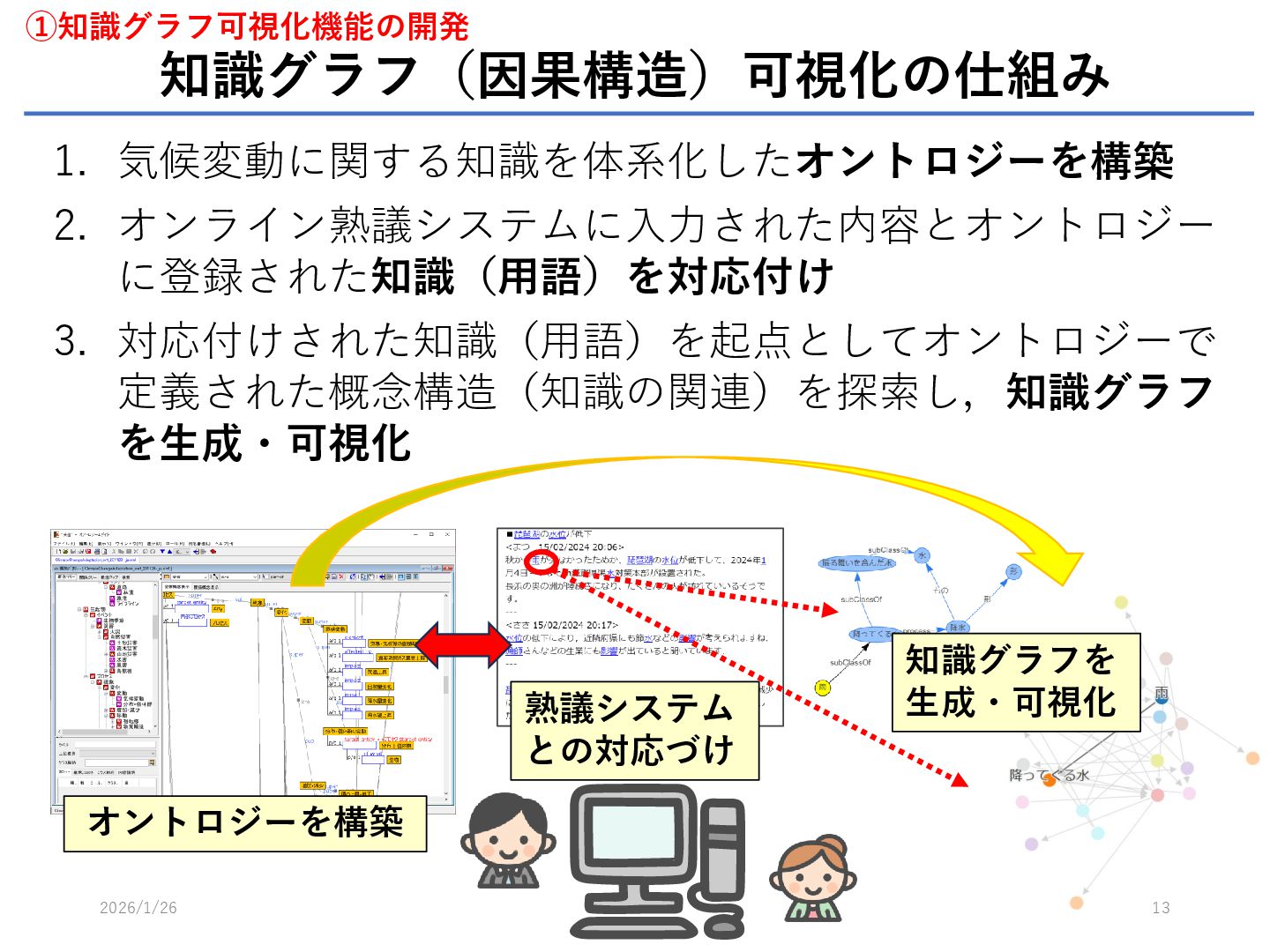 熟議システム との対応づけ 知識グラフを 生成・可視化 オントロジーを構築 ①知識グラフ可視化機能の開発 2026/1/26 13