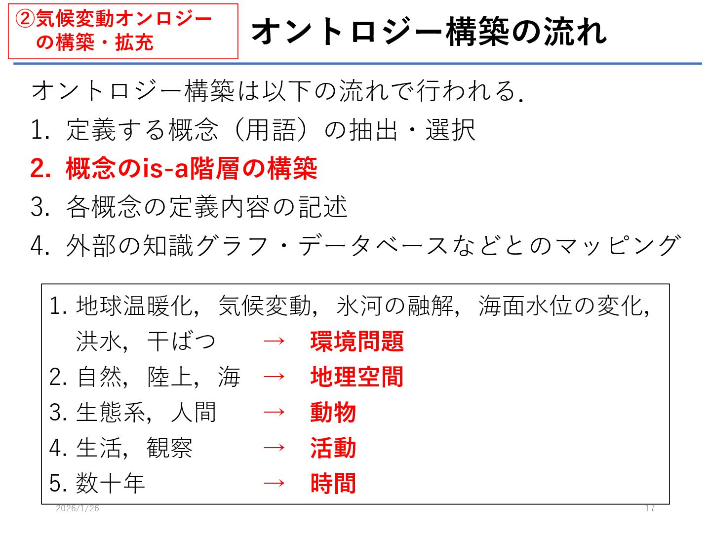地球温暖化,気候変動,氷河の融解,海面水位の変化, 洪水,干ばつ → 環境問題 2. 自然,陸上,海 → 地理空間 3. 生態系,人間 → 動物 4. 生活,観察 → 活動 5. 数十年 → 時間 オントロジー構築の流れ ②気候変動オンロジー の構築・拡充 2026/1/26 17