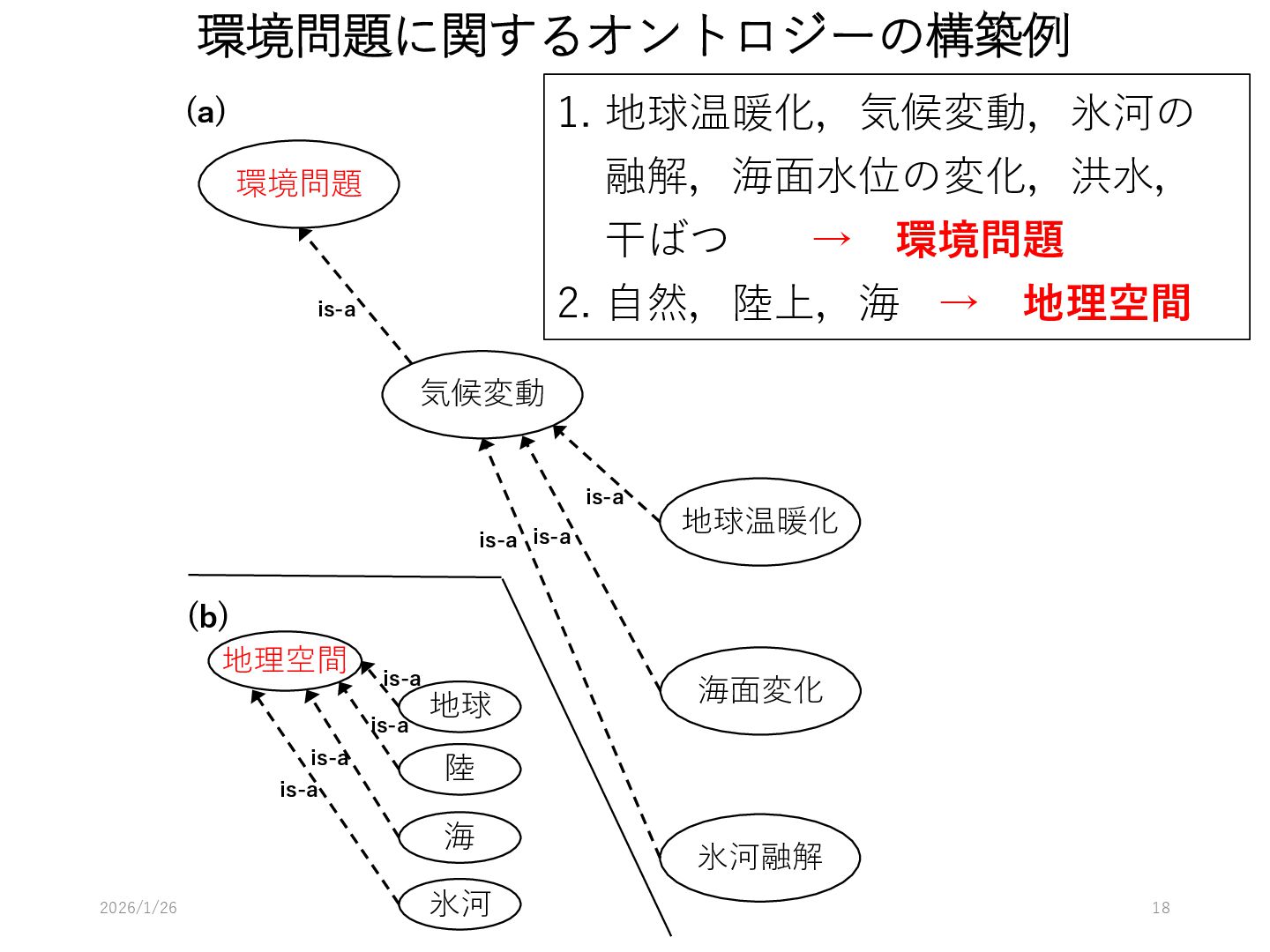 is-a is-a is-a is-a is-a is-a is-a is-a (a) (b) 環境問題に関するオントロジーの構築例 1. 地球温暖化,気候変動,氷河の 融解,海面水位の変化,洪水, 干ばつ → 環境問題 2. 自然,陸上,海 → 地理空間 2026/1/26 18