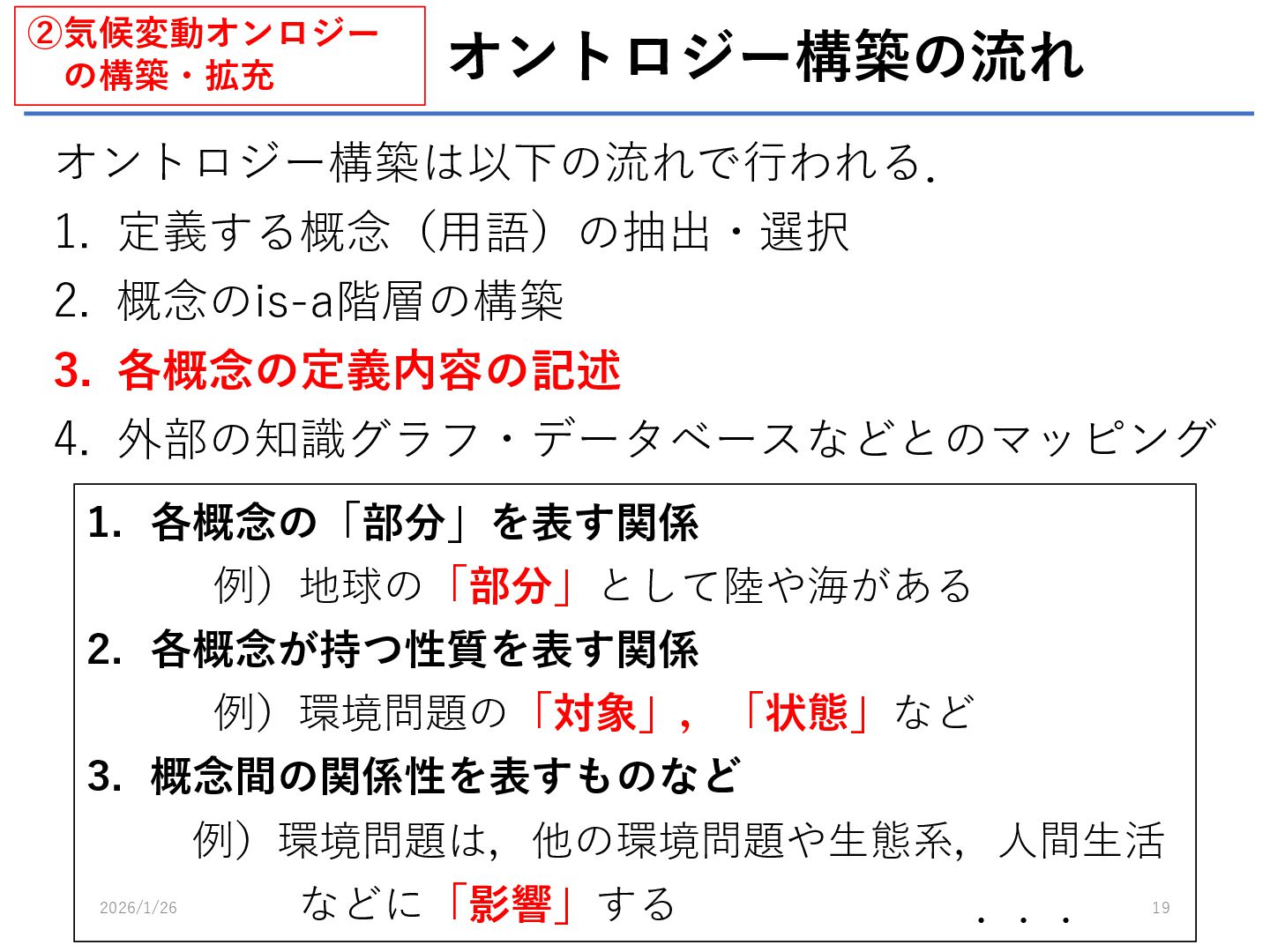 各概念の「部分」を表す関係 例)地球の「部分」として陸や海がある 2. 各概念が持つ性質を表す関係 例)環境問題の「対象」,「状態」など 3. 概念間の関係性を表すものなど 例)環境問題は,他の環境問題や生態系,人間生活 などに「影響」する ... オントロジー構築の流れ ②気候変動オンロジー の構築・拡充 2026/1/26 19