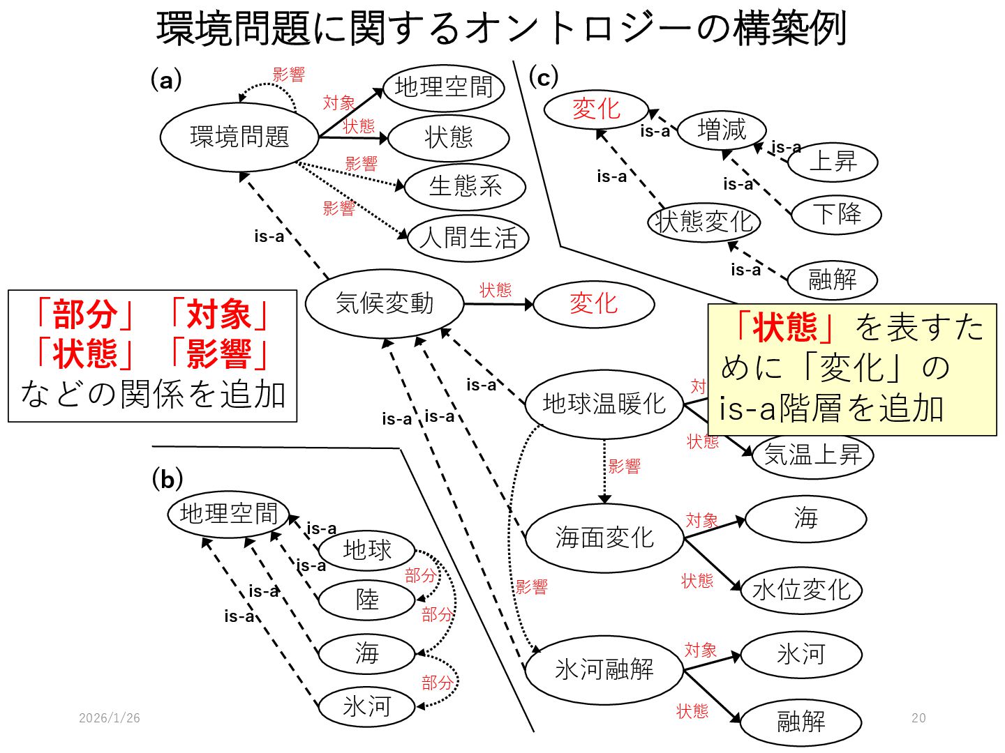 増減 下降 上昇 環境問題 気候変動 地理空間 変化 融解 変化 生態系 人間生活 影響 影響 影響 対象 状態 状態 状態 状態 地理空間 地球 海 陸 氷河 影響 影響 対象 対象 対象 部分 部分 部分 is-a is-a is-a is-a is-a is-a is-a is-a is-a is-a is-a is-a is-a (a) (c) (b) 状態 状態 環境問題に関するオントロジーの構築例 「部分」「対象」 「状態」「影響」 などの関係を追加 「状態」を表すた めに「変化」の is-a階層を追加 2026/1/26 20