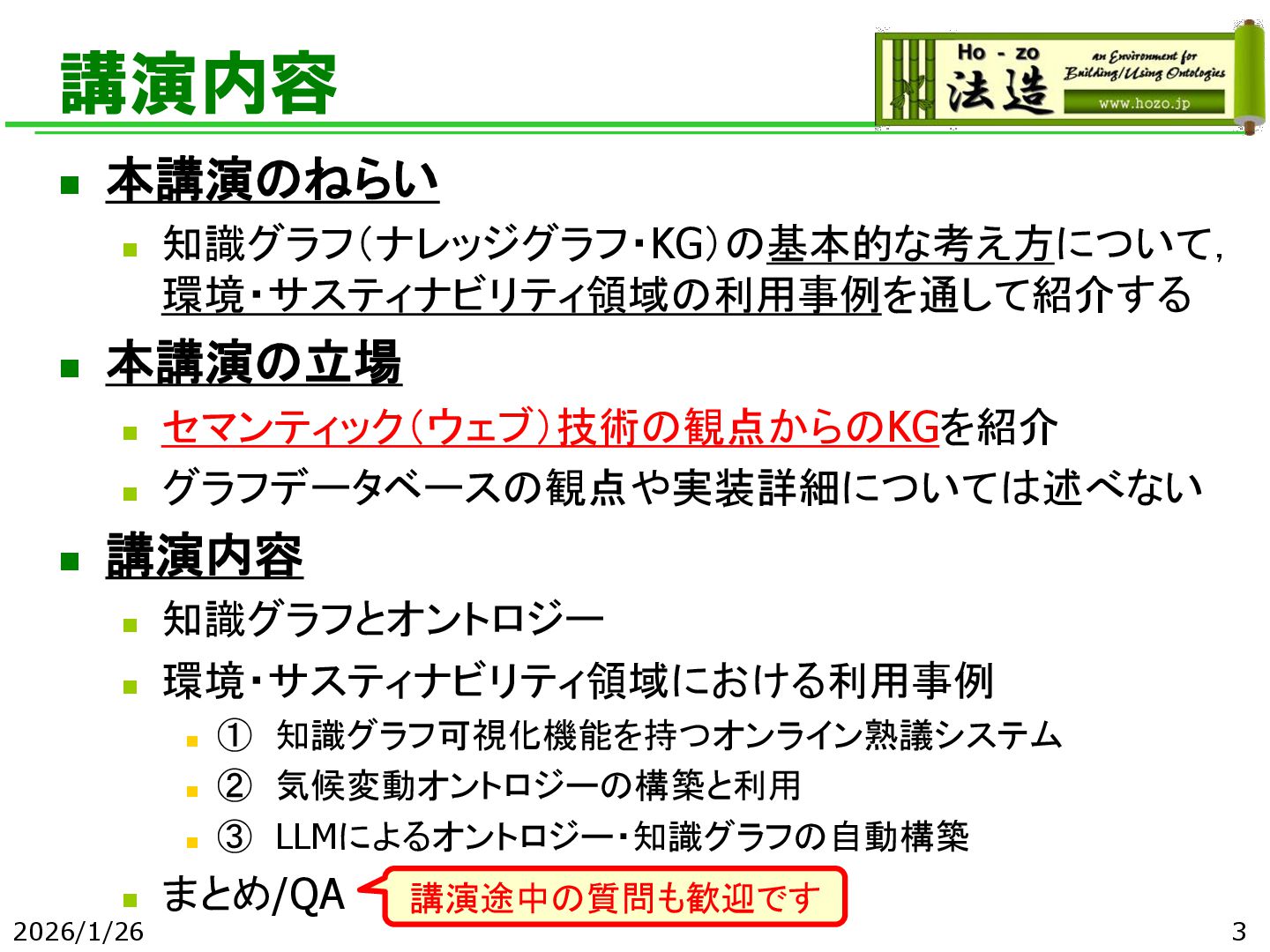グラフデータベースの観点や実装詳細については述べない ◼ 講演内容 ◼ 知識グラフとオントロジー ◼ 環境・サスティナビリティ領域における利用事例 ◼ ① 知識グラフ可視化機能を持つオンライン熟議システム ◼ ② 気候変動オントロジーの構築と利用 ◼ ③ LLMによるオントロジー・知識グラフの自動構築 ◼ まとめ/QA 講演内容 2026/1/26 3 講演途中の質問も歓迎です