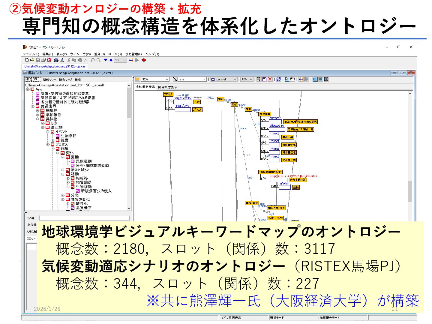 専門知の概念構造を体系化したオントロジー 地球環境学ビジュアルキーワードマップのオントロジー 概念数:2180,スロット(関係)数:3117 気候変動適応シナリオのオントロジー(RISTEX馬場PJ) 概念数:344,スロット(関係)数:227 ※共に熊澤輝一氏(大阪経済大学)が構築 ②気候変動オンロジーの構築・拡充 2026/1/26 21